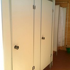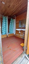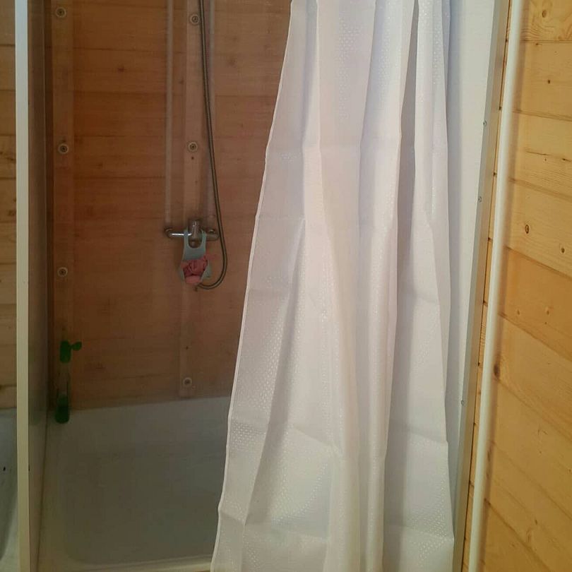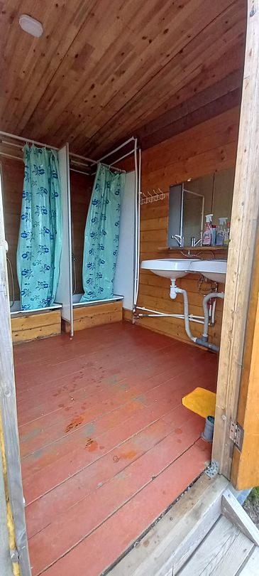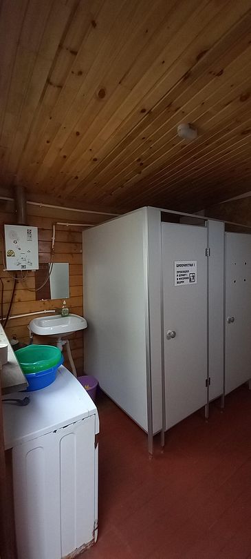 Отдельное строение рядом, в 3-х шагах от номеров, куда подведены коммуникации от биологического септика и скважины, где вода круглосуточно подогревается с помощью водонагревателя.