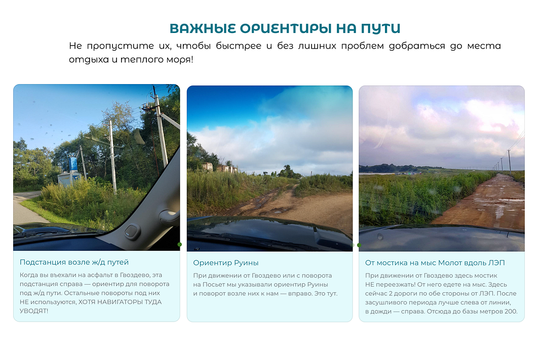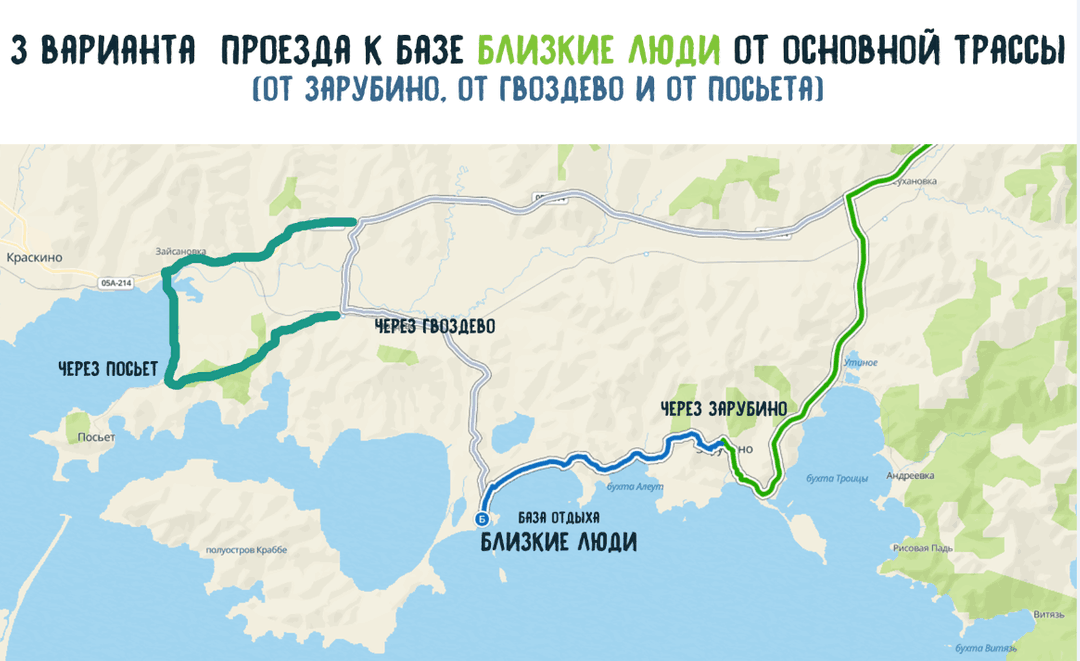 Запасной вариант на затяжные ливни — через поворот на Посьет (путь длиннее, но повреждается меньше в дожди).Дневное пребывание гостей