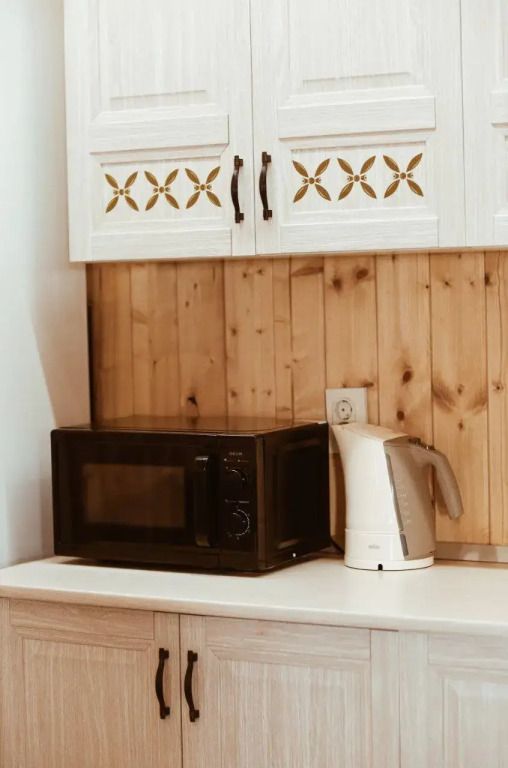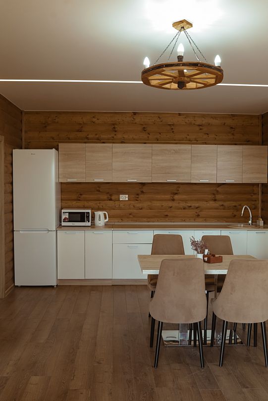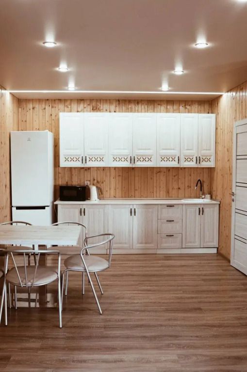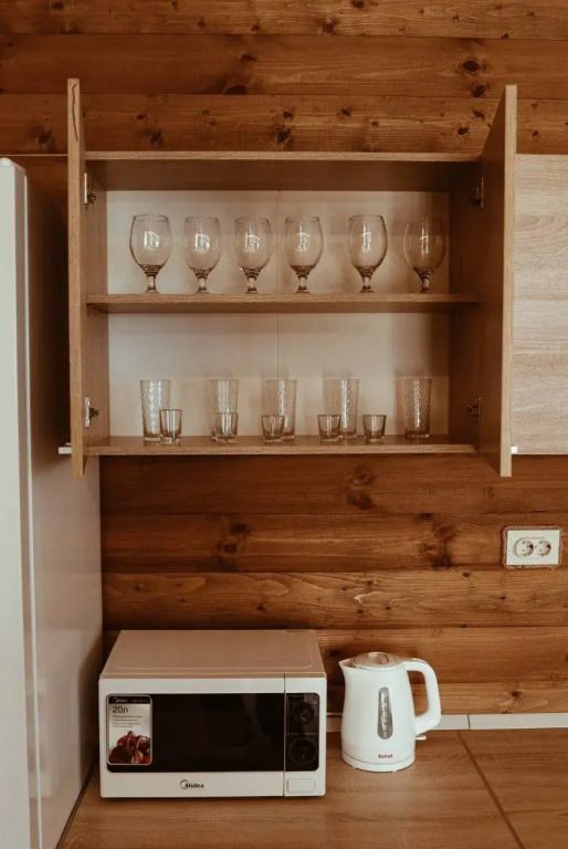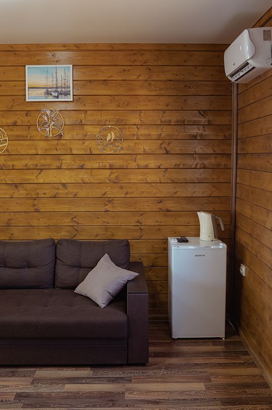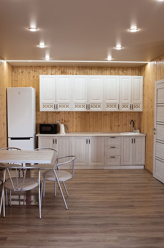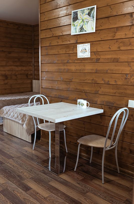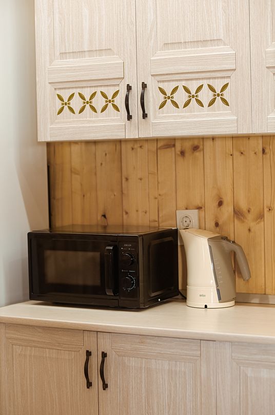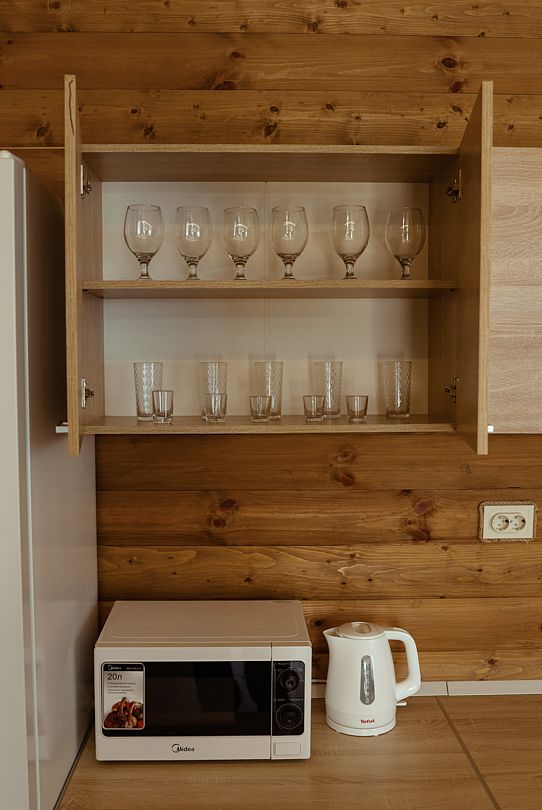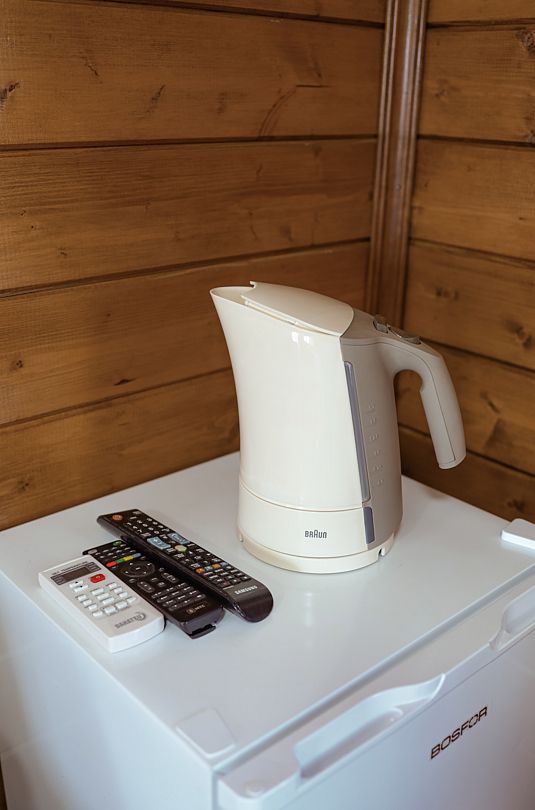 В некоторые тарифы питание включено в стоимость проживания. Дополнительно за отдельную плату можно приобрести комплексное питание в кафе на территории. Помимо этого, номера оснащены холодильником, чайником и набором посуды. А в доме имеется еще и микроволновая печь.
