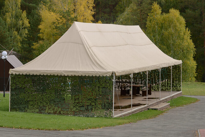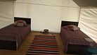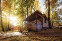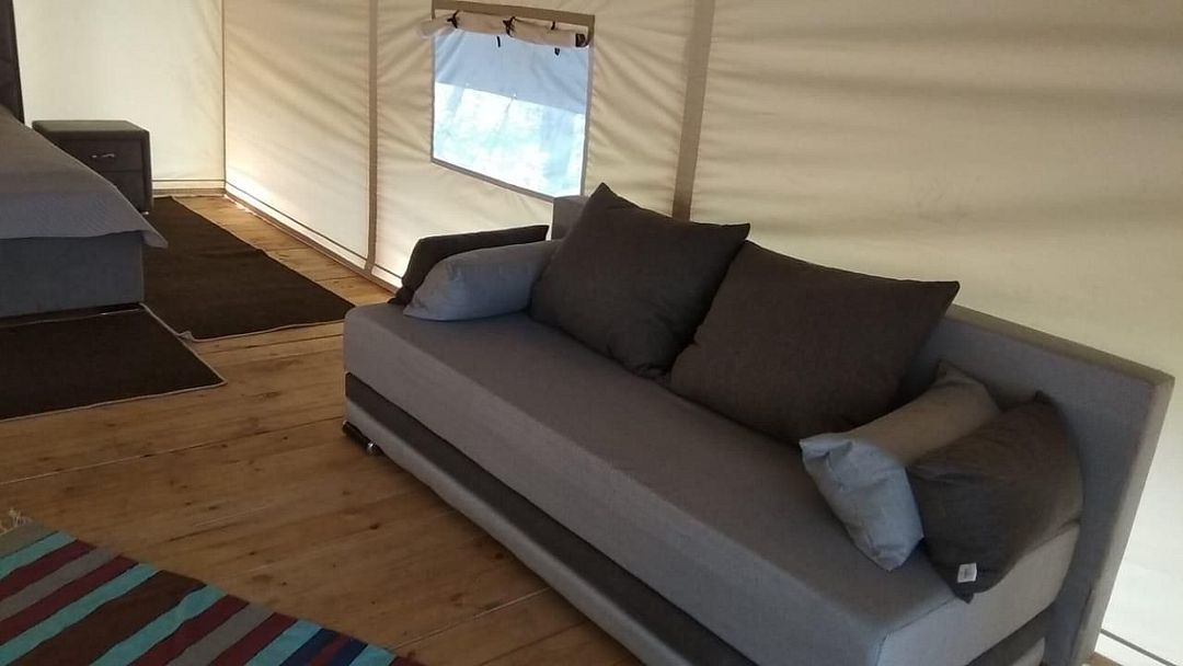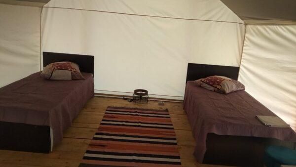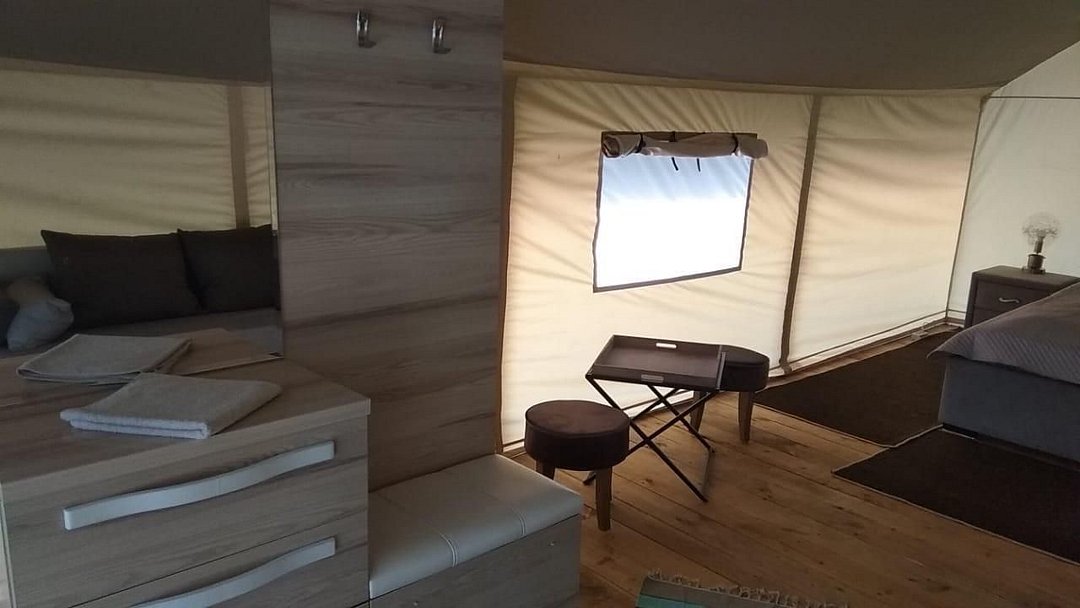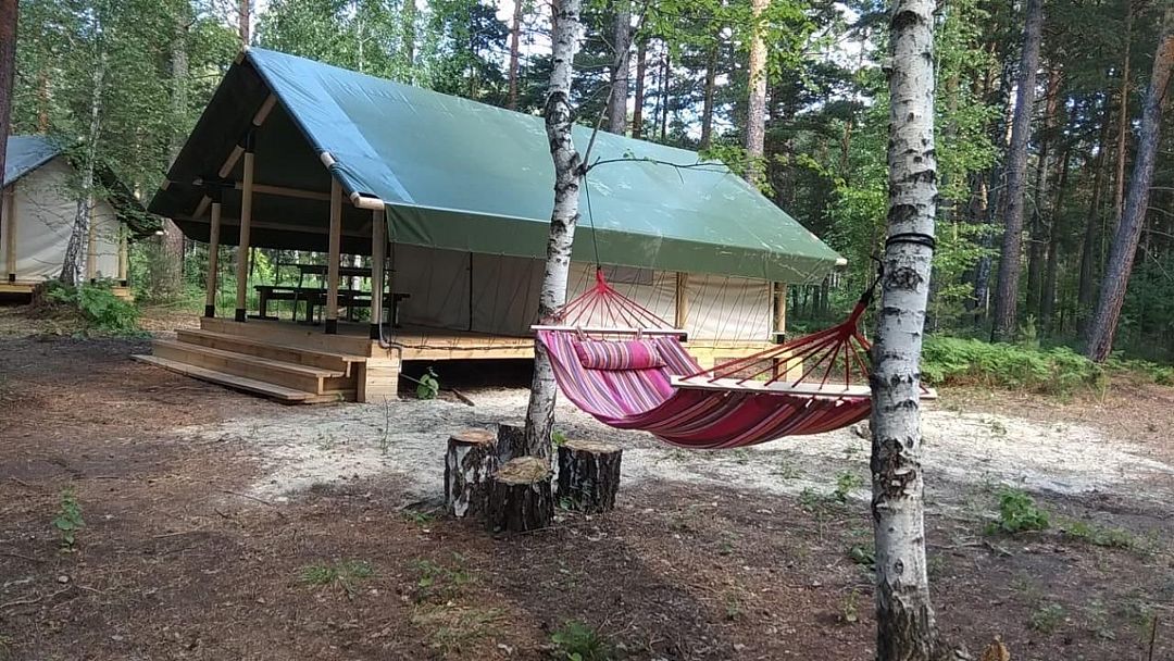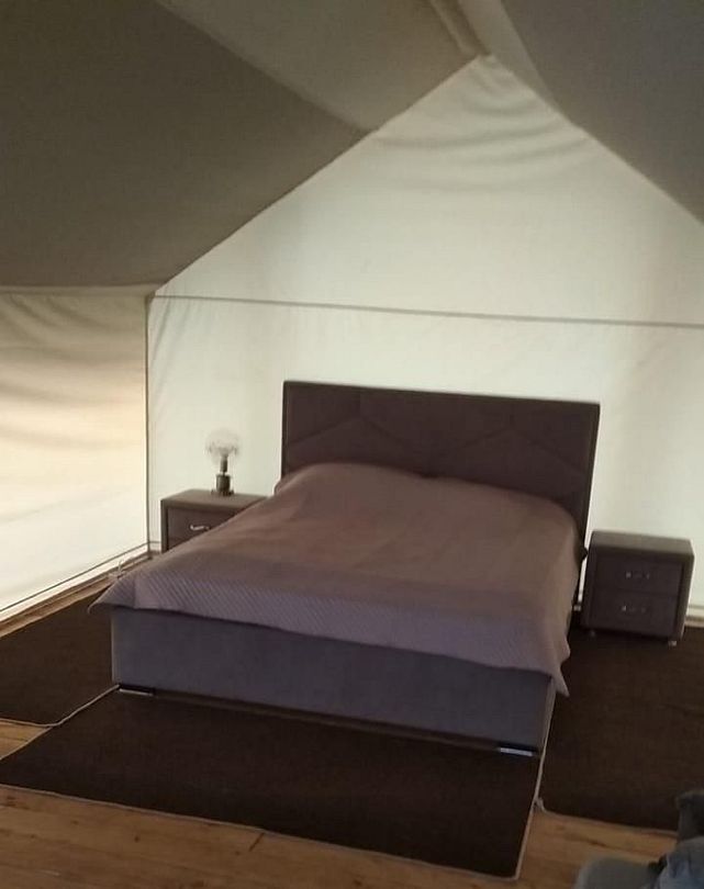 Шатер оборудован всем необходимым: удобные кровати и обеденная зона. Шатры стоят на пригорке в окружении деревьев, вдали от причала и жилых домиков, что обеспечивает относительную тишину и бесподобный аромат хвои.