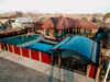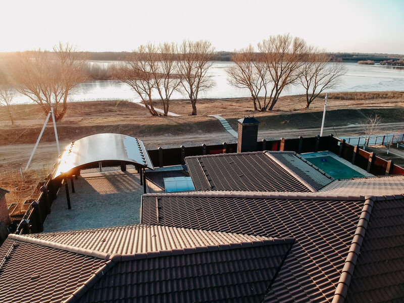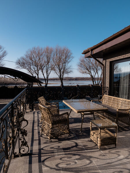 Гости могут насладиться плаванием в бассейне с противотоком и подогревом, расслабиться на массажных лежаках под роскошным навесом и насладиться живописным видом на реку с открытой веранды. А веранда под крышей обеспечивает комфортное пространство для отдыха даже в случае изменчивой погоды.