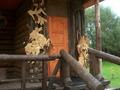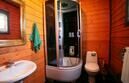 Уютный предбанный зал с камином позволяет вместить до 10 гостей. Санузел, душевая находятся так же на первом этаже. Парная вмещает до 4 человек одновременно. На втором этаже находятся две комнаты отдыха с телевизором в каждой. Со стороны улицы баня оборудована красивой верандой, украшенной тематической резьбой по дереву. Рядом мангал, выход к пруду и проруби.