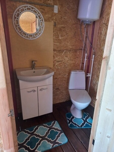 Туалетная комната: унитаз, душевая кабина, раковина, водонагреватель.