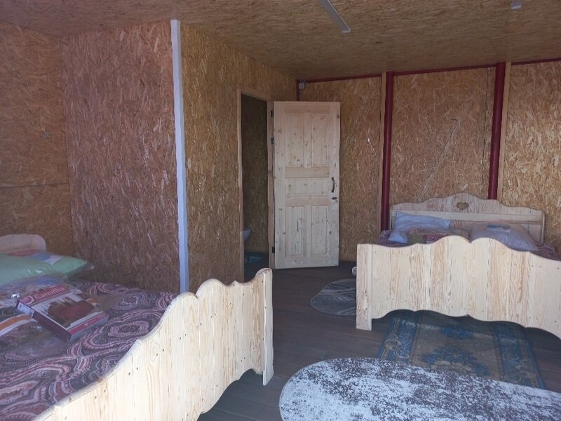Обстановка домика: две 2-х спальные кровати, холодильник, чайник, телевизор, обеденный стол, кухонная тумба, раковина, посуда.