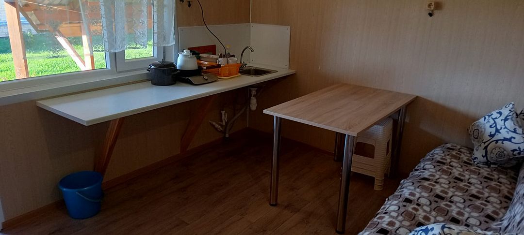В номерах есть кухня: индукционная плита с набором посуды, холодильник, мойка с холодной и горячей водой, кухонный стол.