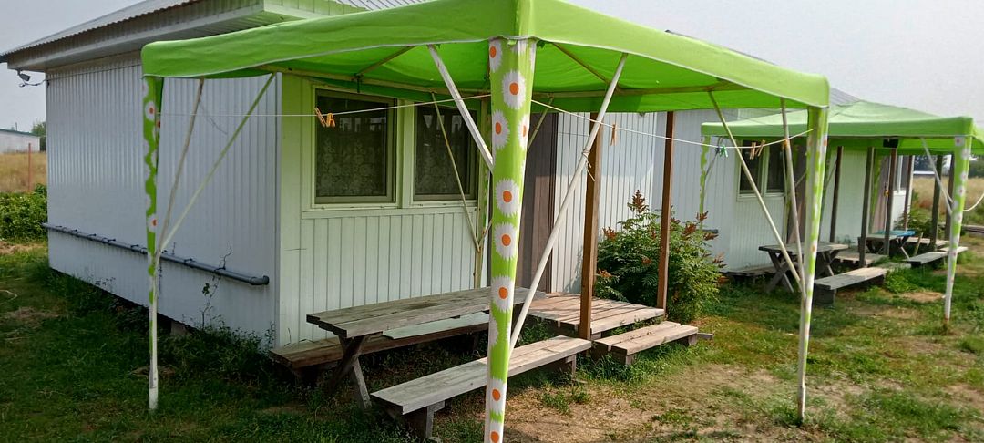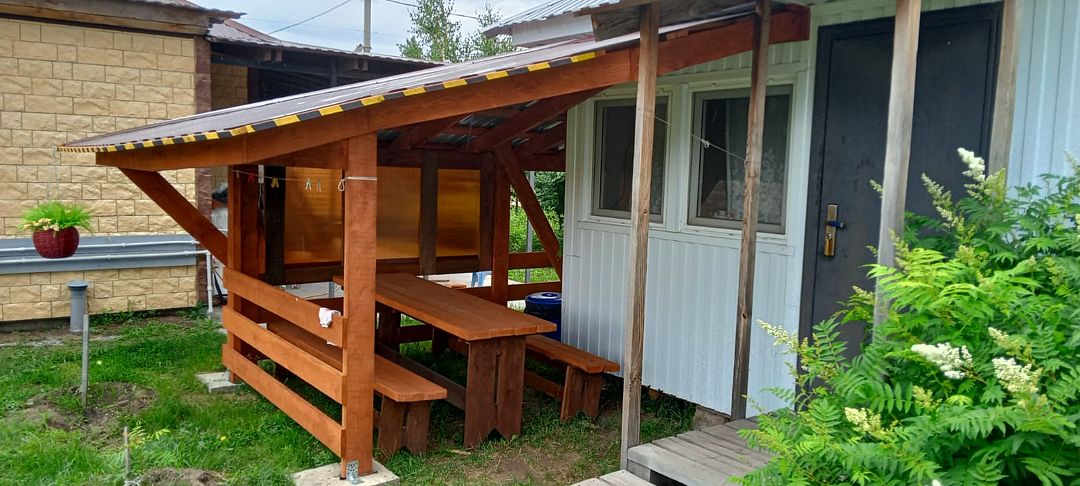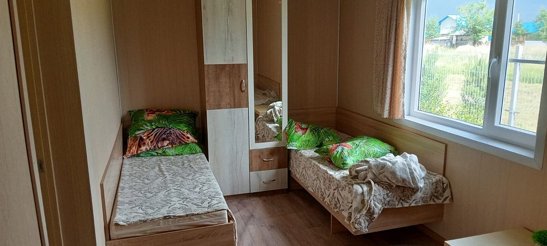 В номерах обязательно кухня (индукционная плита с набором посуды, холодильник, мойка с хол. и гор. водой, кухонный стол), спальное помещение с одной 2-х спальной и одной либо двумя односпальными кроватями, санузел (с унитазом, раковиной, душем с хол. и гор. водой), уличный навес со столом и скамьями.