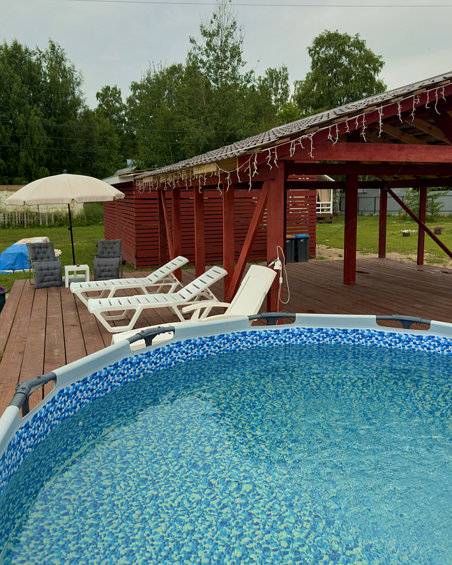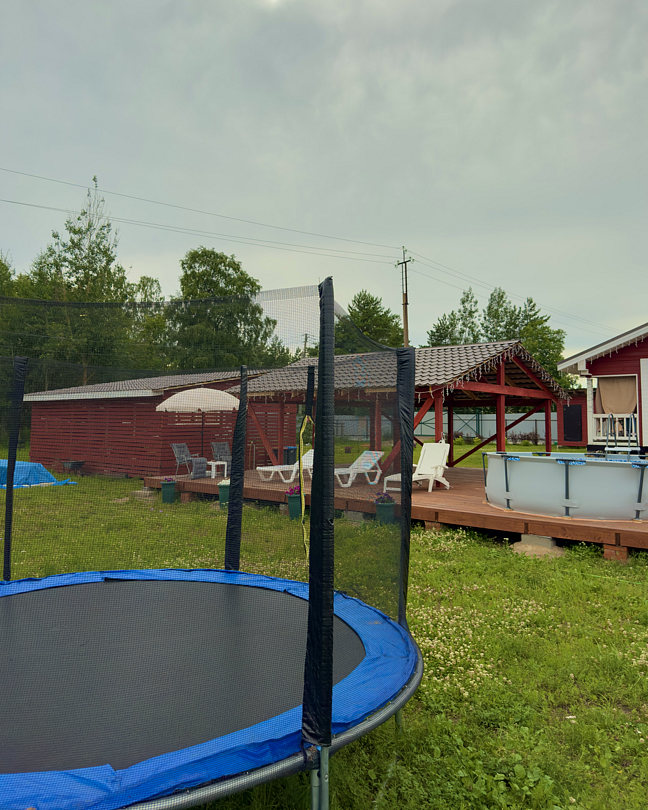 На улице рядом с домом парковочное место, мангал с шампурами и решеткой для барбекю, стол с зонтом и скамейками. В солнечную погоду можно позагорать на шезлонгах и искупаться в небольшом бассейне, для детей есть батут. Разнообразить досуг и наполнить его незабываемыми впечатлениями помогут русская баня на дровах и банный чан. В коттедже возможно размещение с животными.