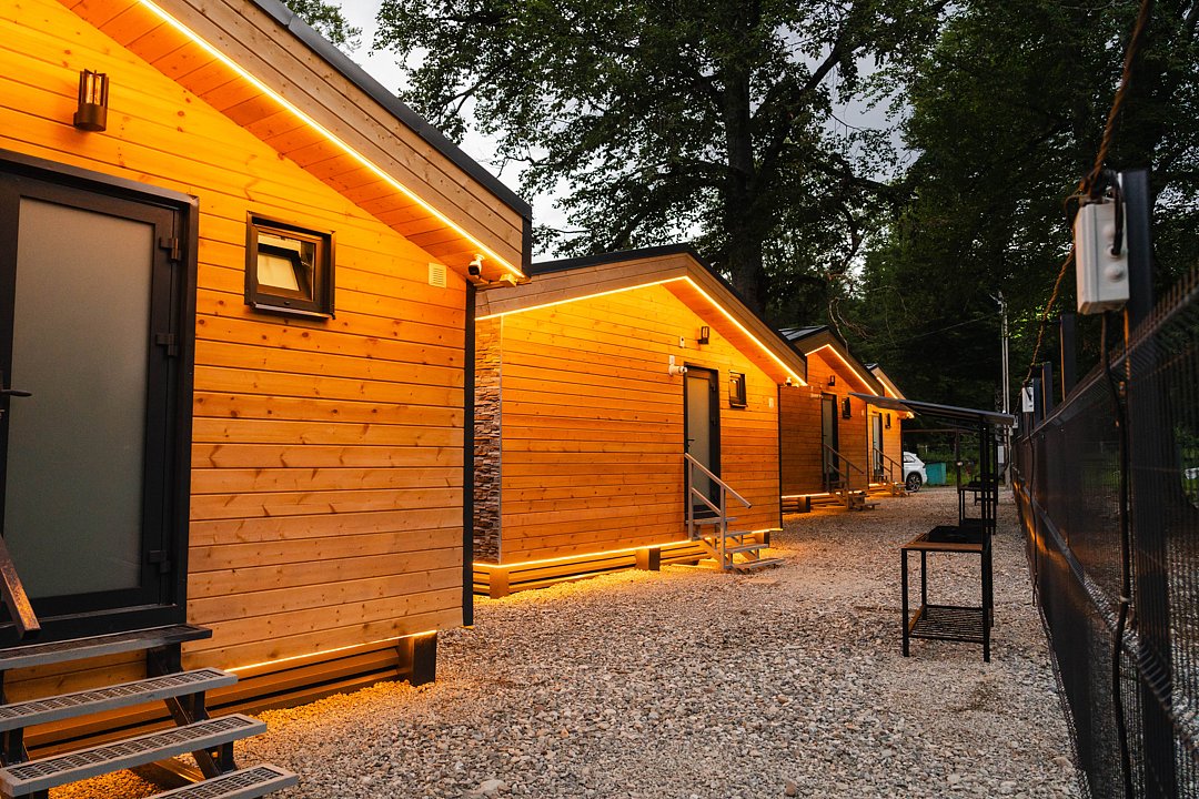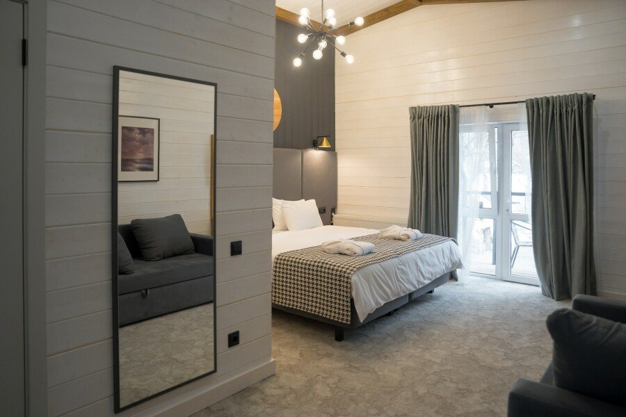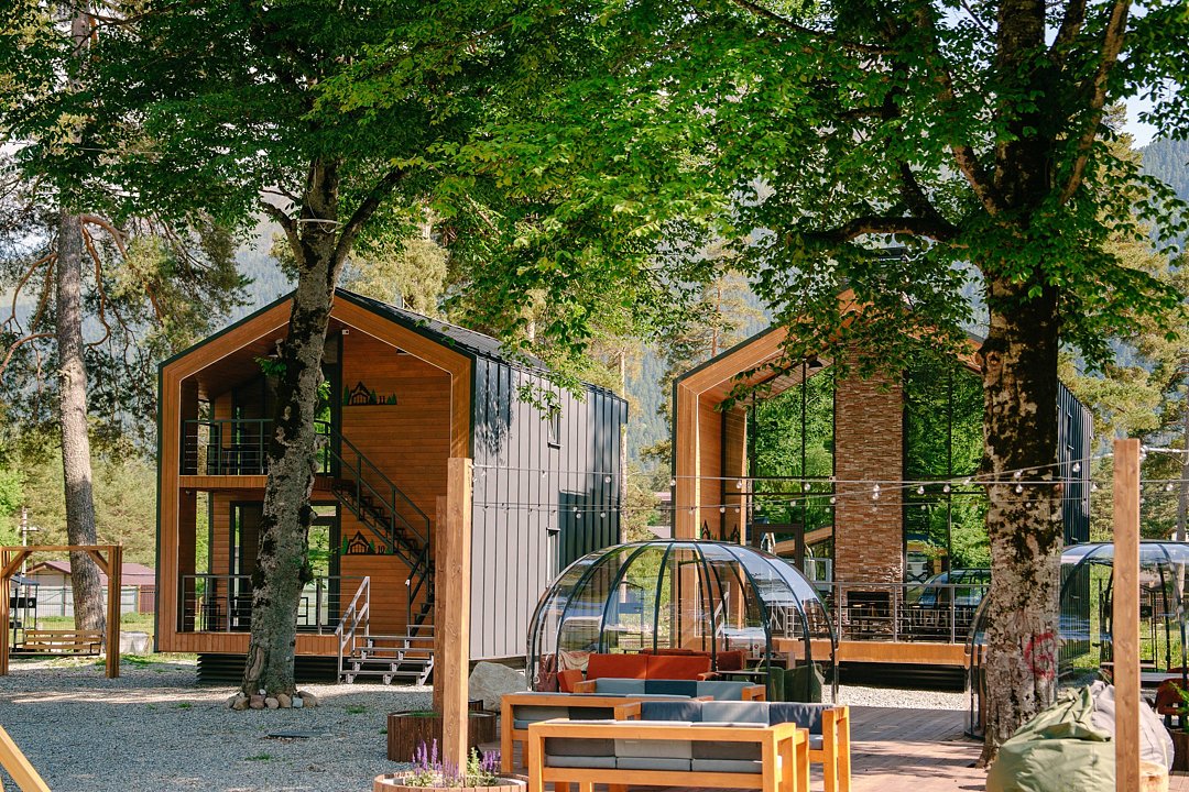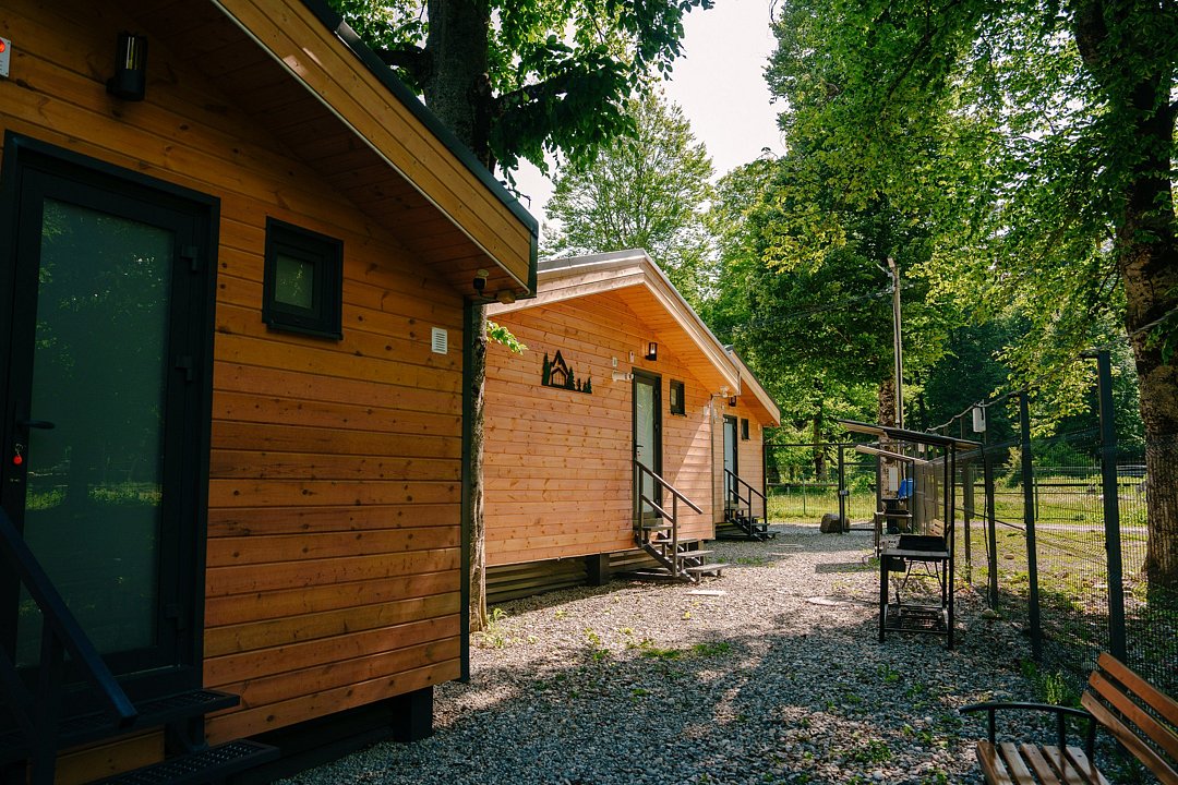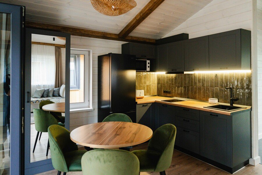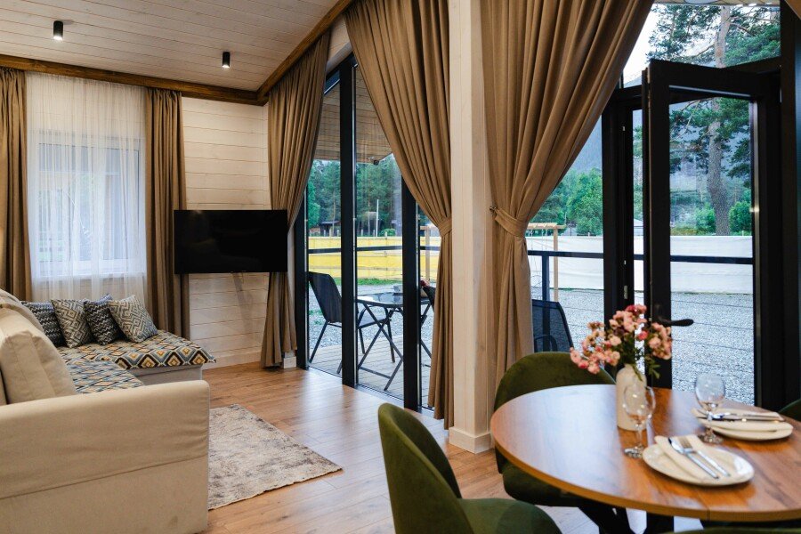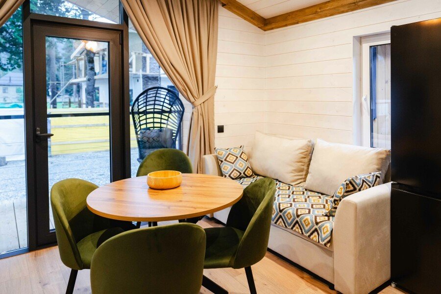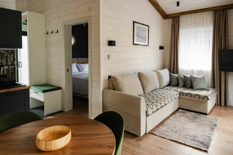 Современные домики комплекса сочетают простоту дизайна с продуманным комфортом. Просторные номера с оборудованными кухнями, удобной мебелью и теплыми интерьерами подходят как для семейного отдыха, так и для романтического уединения. Здесь легко почувствовать себя как дома: приготовить ужин из местных продуктов, собраться за столом с близкими или просто расслабиться после дня, проведенного на природе.