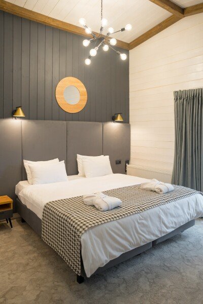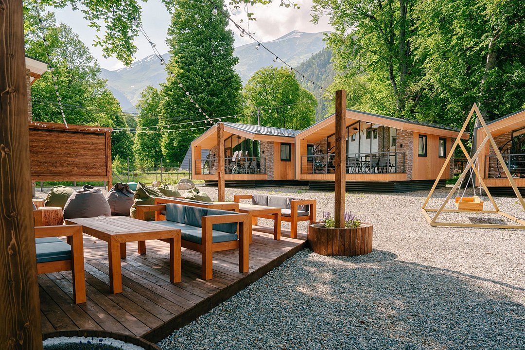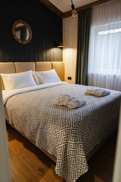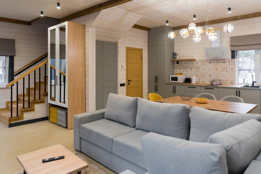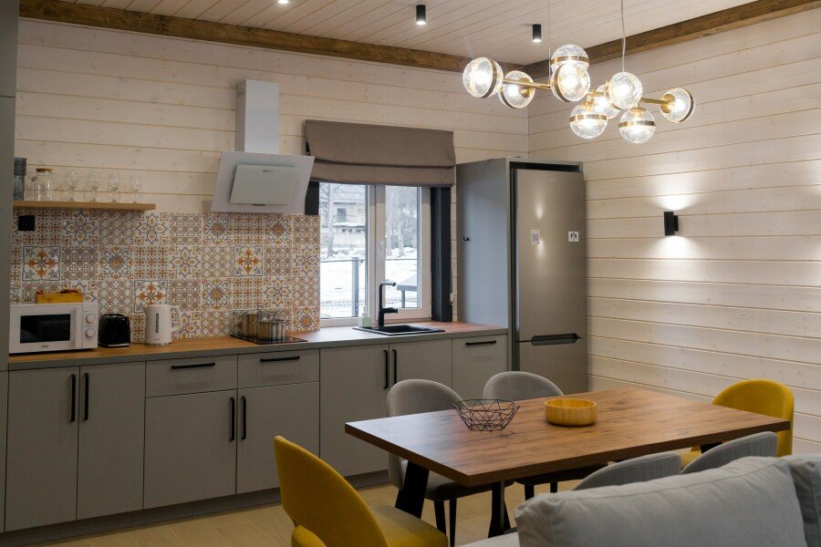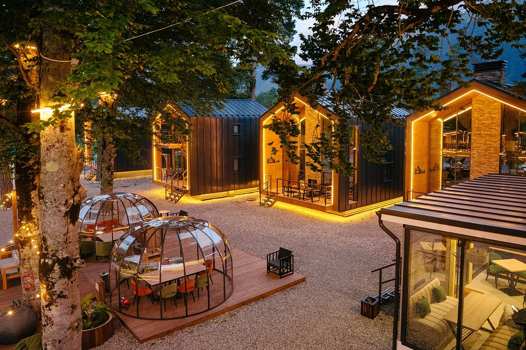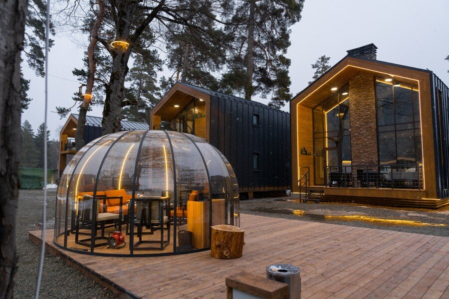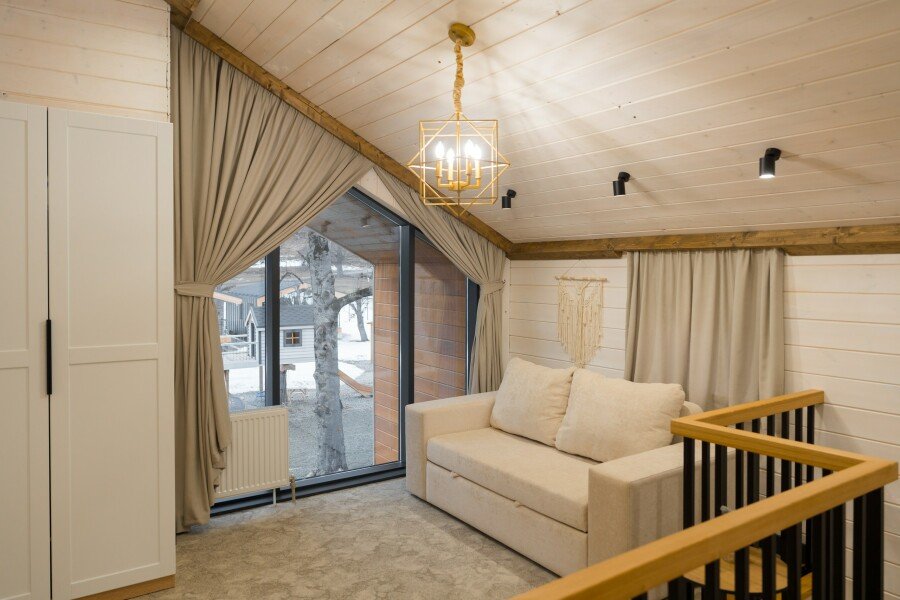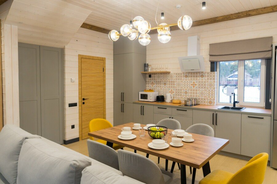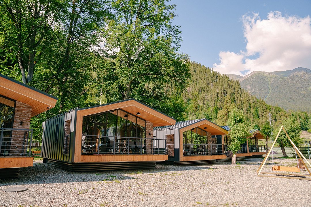 Современные домики комплекса сочетают простоту дизайна с продуманным комфортом. Просторные номера с оборудованными кухнями, удобной мебелью и теплыми интерьерами подходят как для семейного отдыха, так и для романтического уединения. Здесь легко почувствовать себя как дома: приготовить ужин из местных продуктов, собраться за столом с близкими или просто расслабиться после дня, проведенного на природе.
