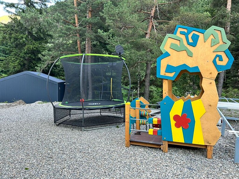 Большая оборудованная детская игровая зона с горкой, батутом и песочницей.