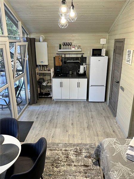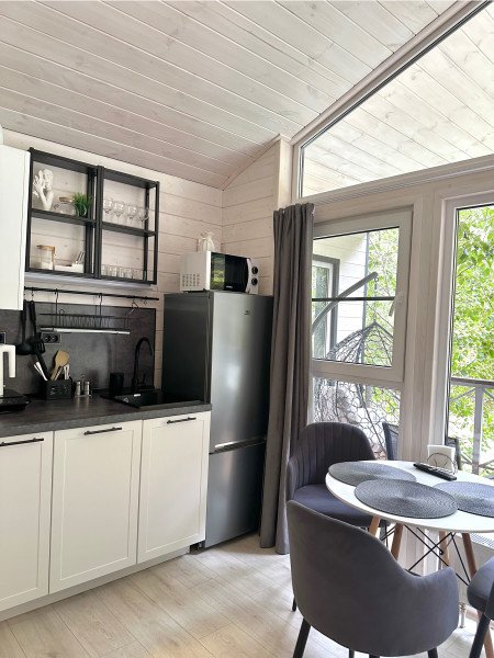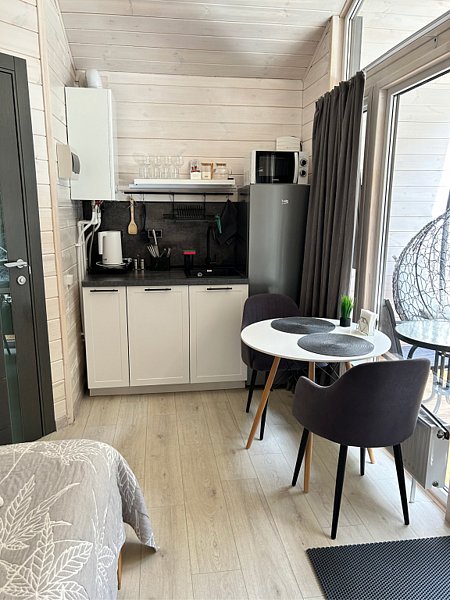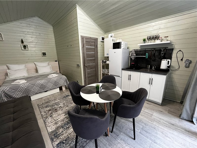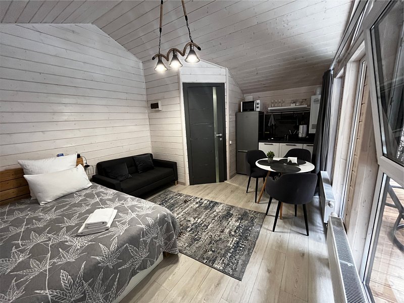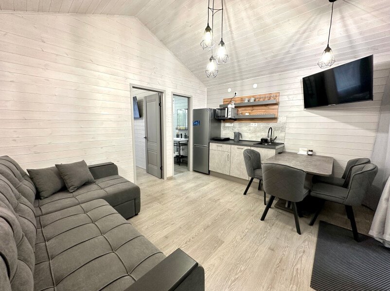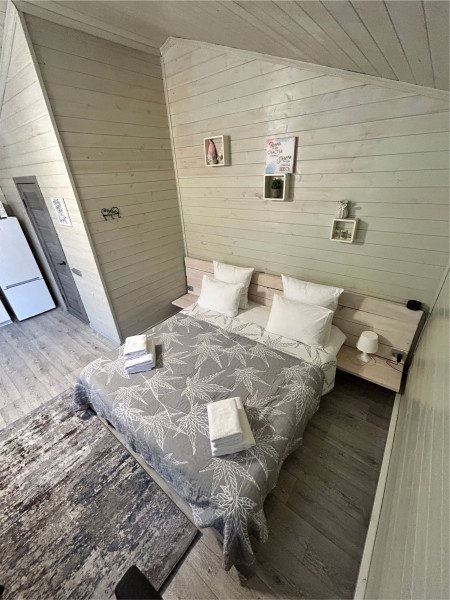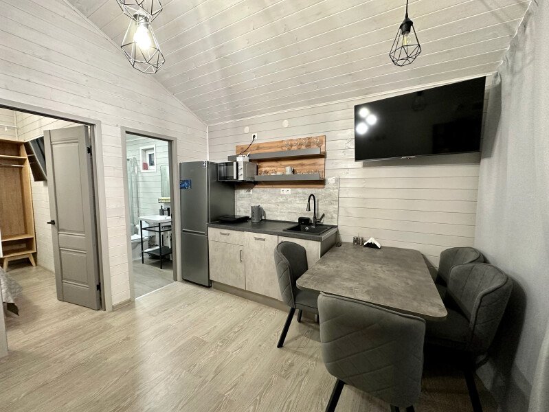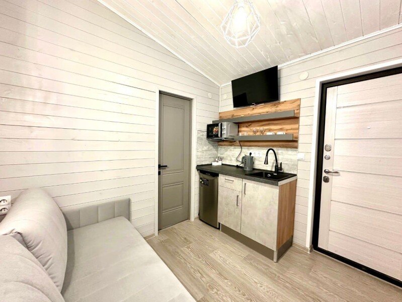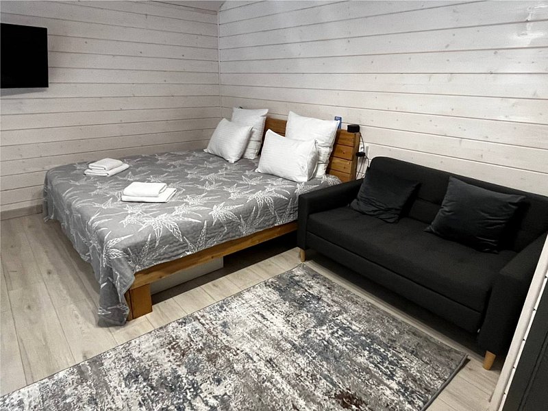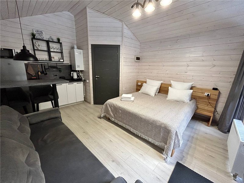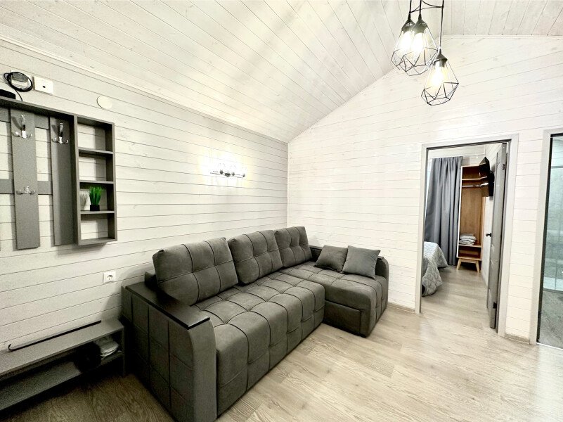 Во второй части находится отдельная полноценная комната с раскладным диваном, собственным сан узлом, душем и кухонной зоной с холодильним, чайником, микроволновкой.