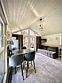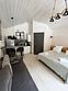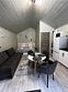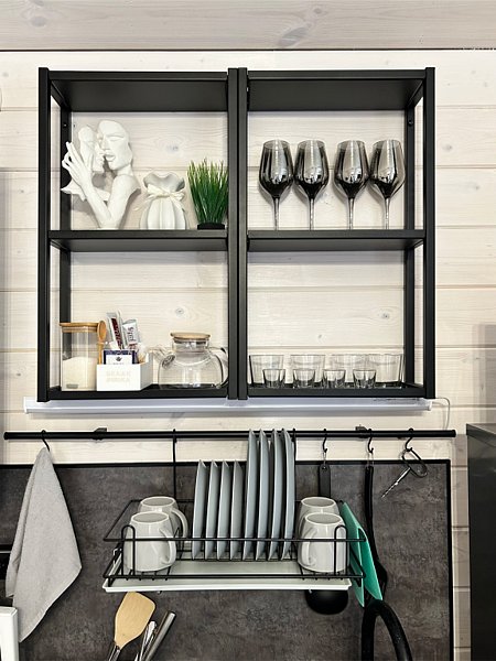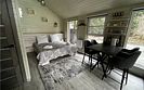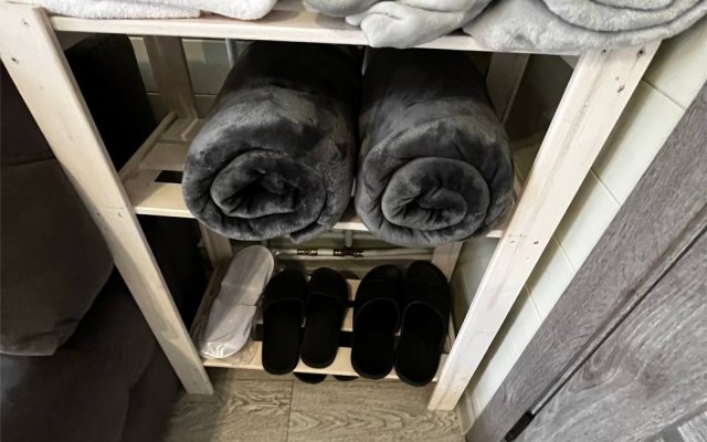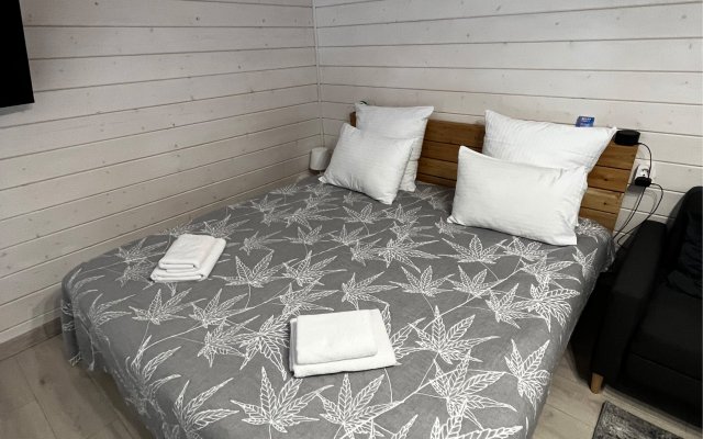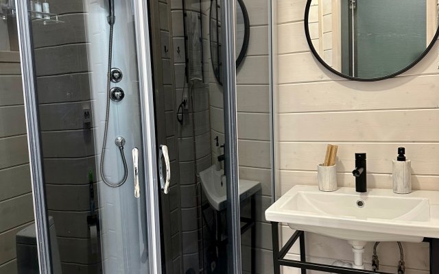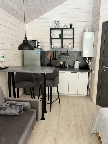 В первой части находится спальня, кухня гостиная и сан узел с душем.