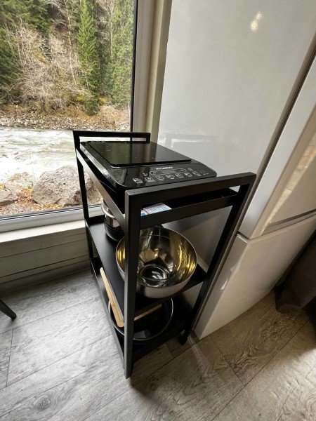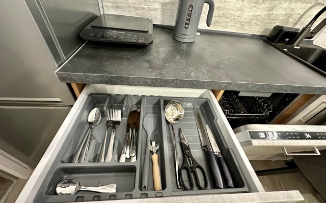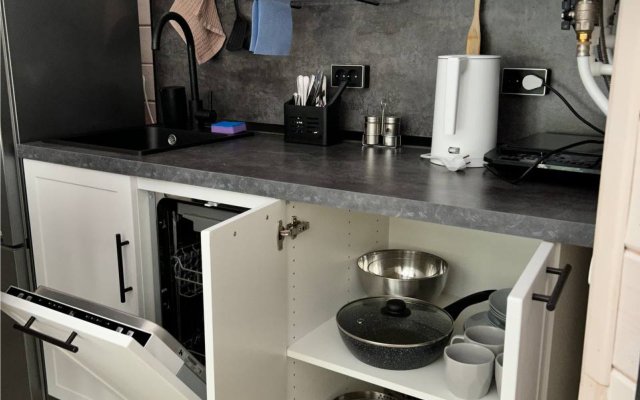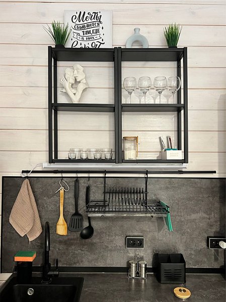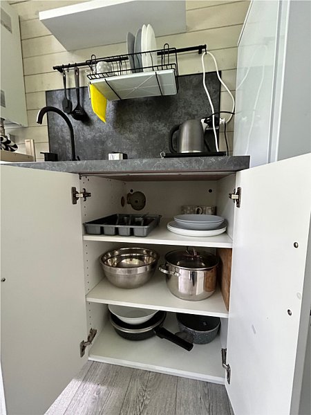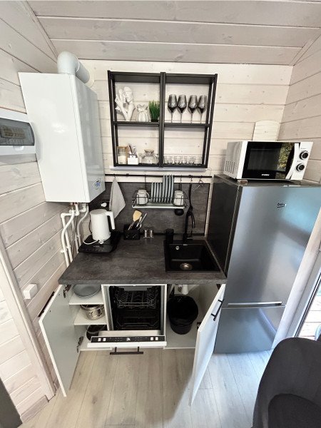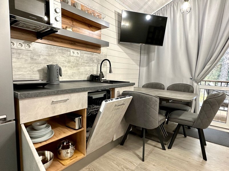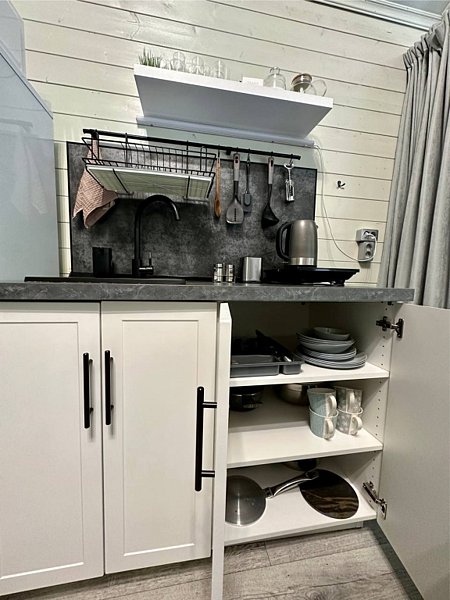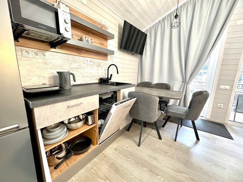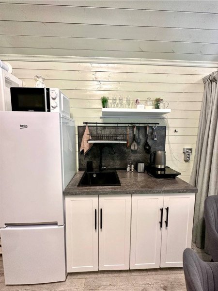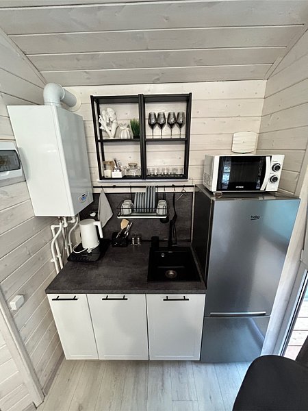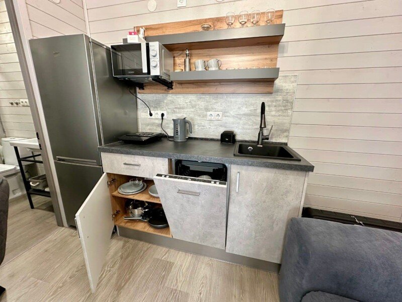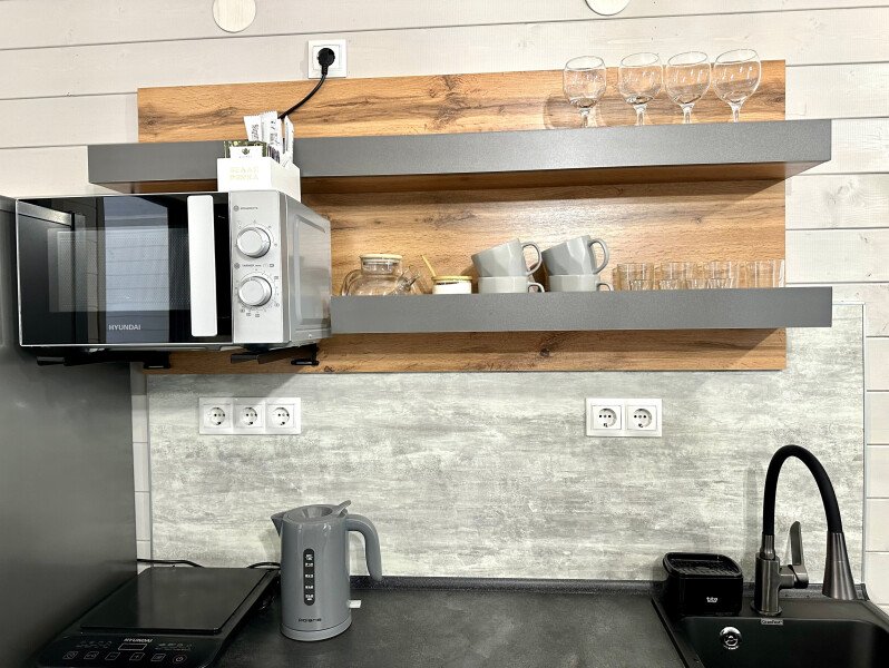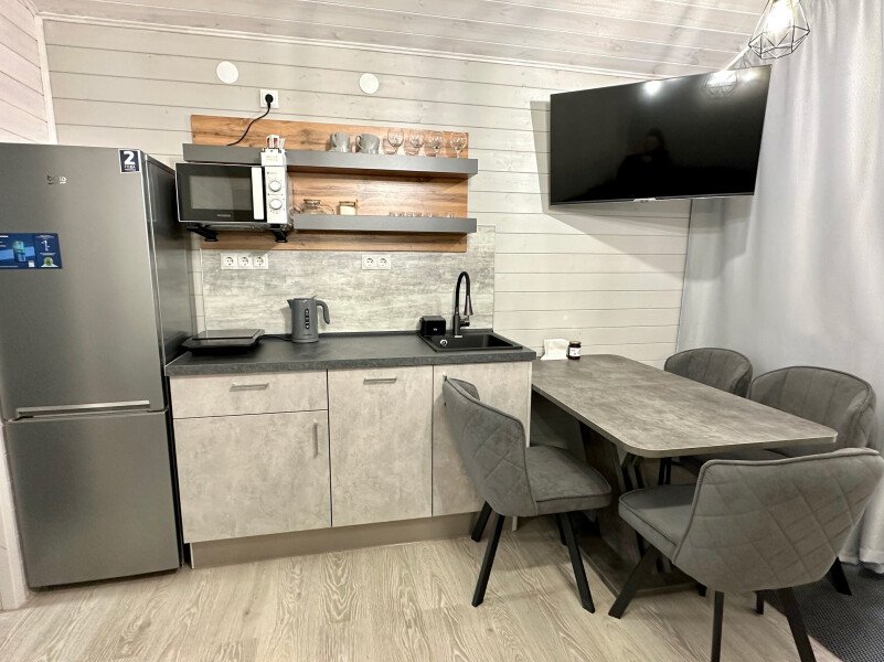 ✓ кухней, холодильником, микроволновой печью, электроплитой, чайником, посудой;