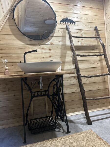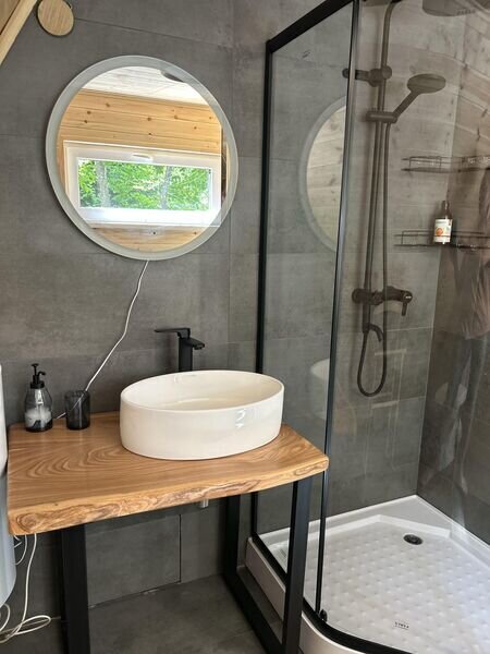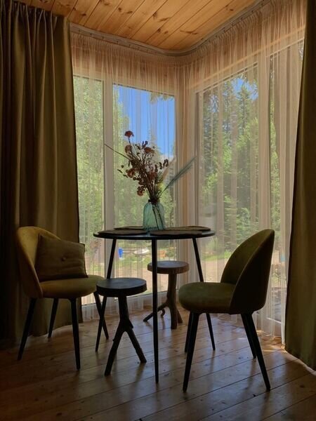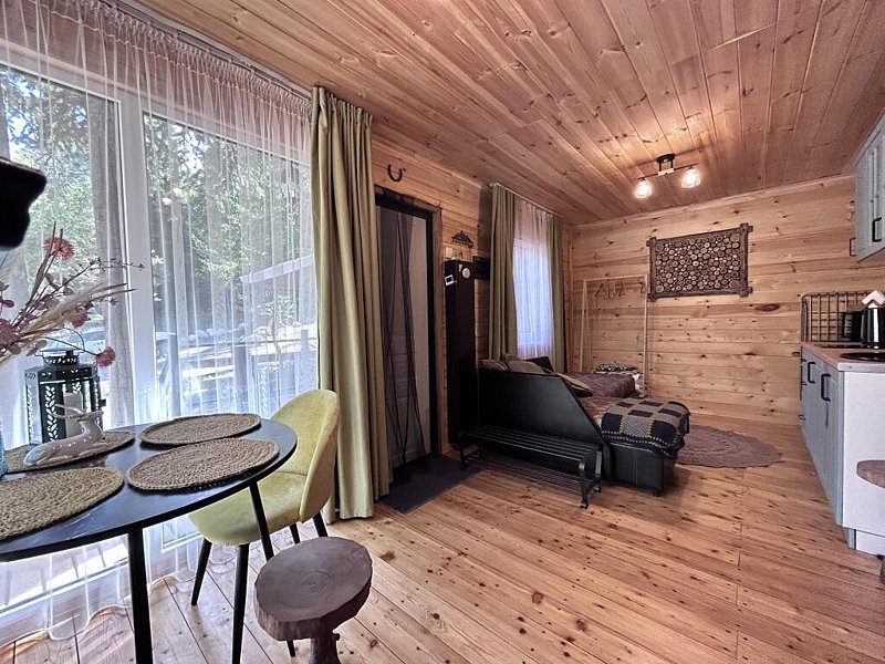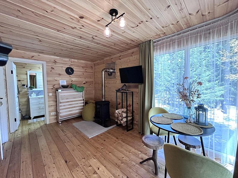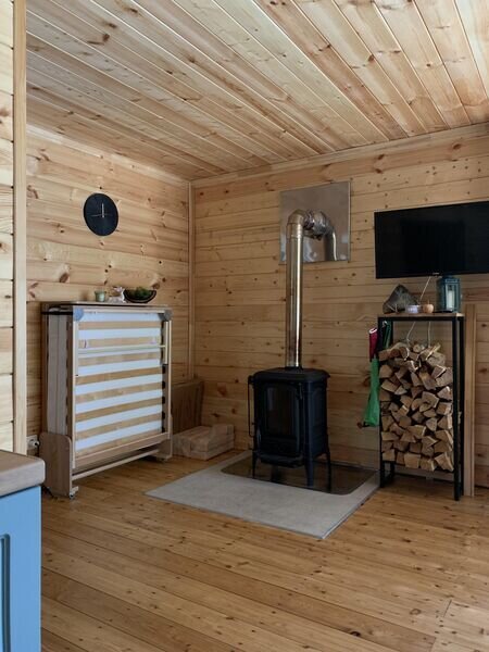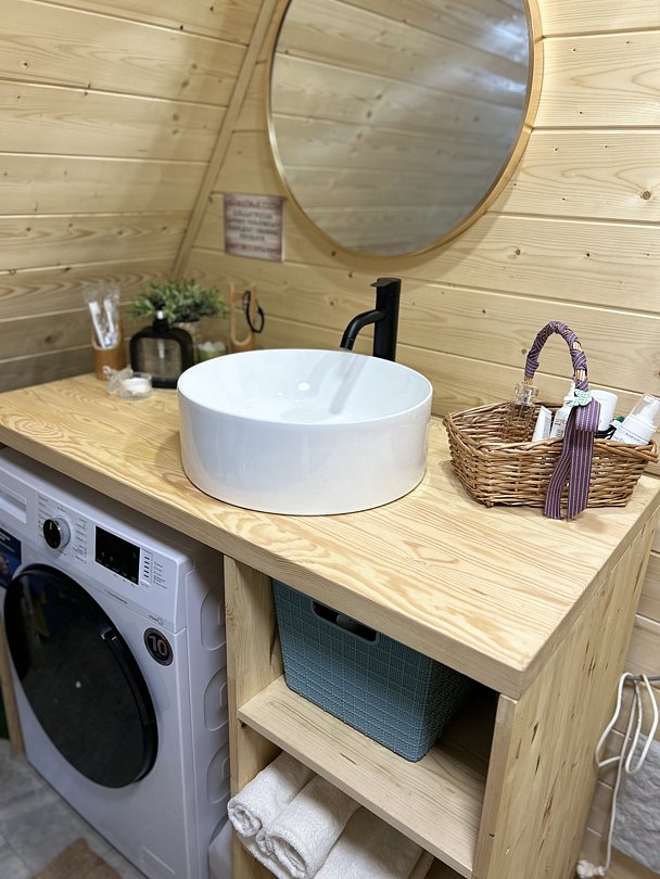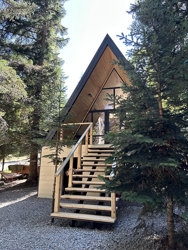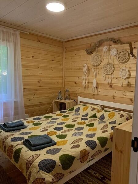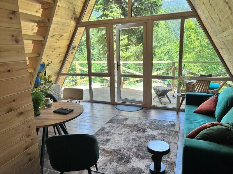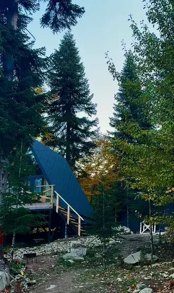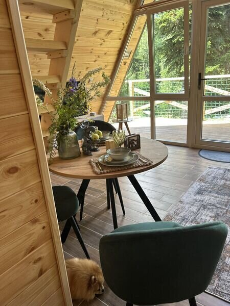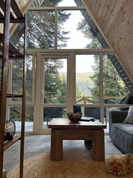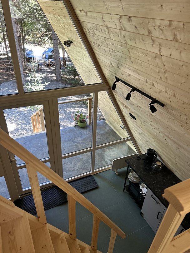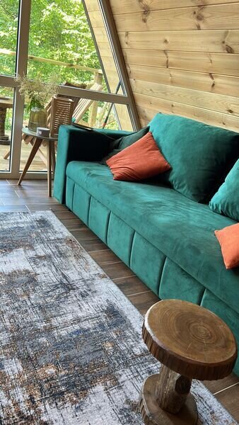 Новый уютный дом в стиле А-фрейм с отдельной спальней и вторым светом, так же есть двуспальное место на антресоли. В кухни-столовой удобный раскладной диван,всего 6 спальных мест. Дом оборудован всем необходимым для жизни. В кухонной зоне есть холодильник, микроволновая печь, индукционная печь, кофемашина, электрический чайник, столовые приборы, турецкий фарфоровый сервис, чайные и кофейные чашки, набор кастрюль и сковорода, телевизор с Алисой и интернет, парковка.