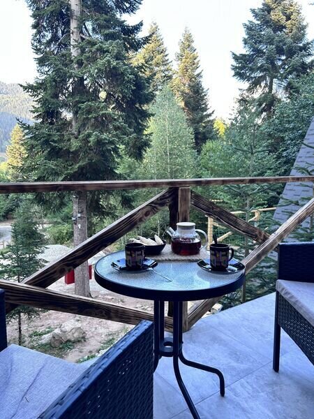 Студия, с антресолями для спального места, с кухонной зоной и отдельным сан.узлом. В доме все необходимое для проживания. С террасы открывается шикарный вид на горы.