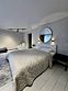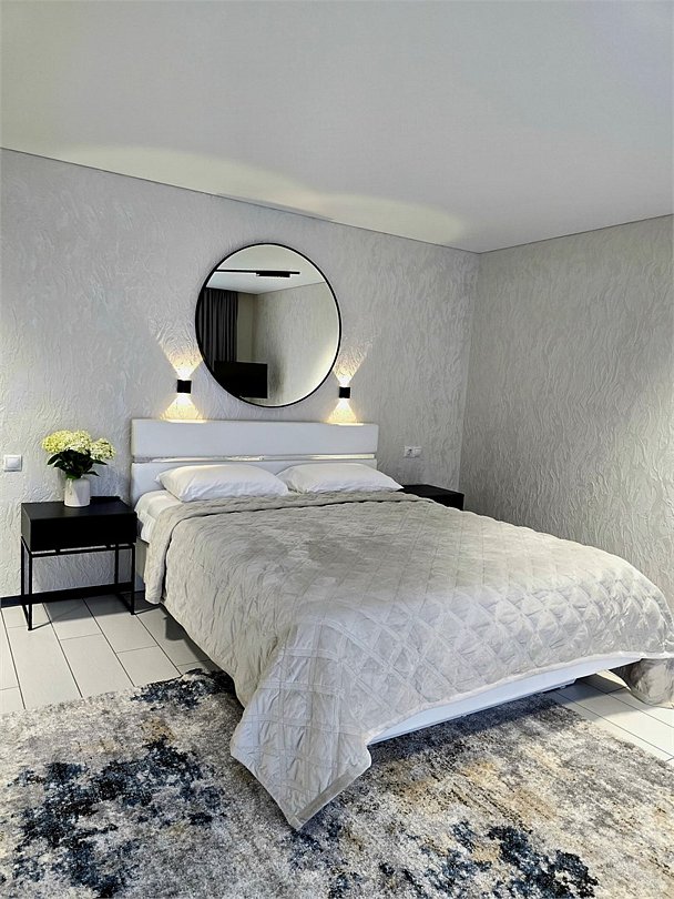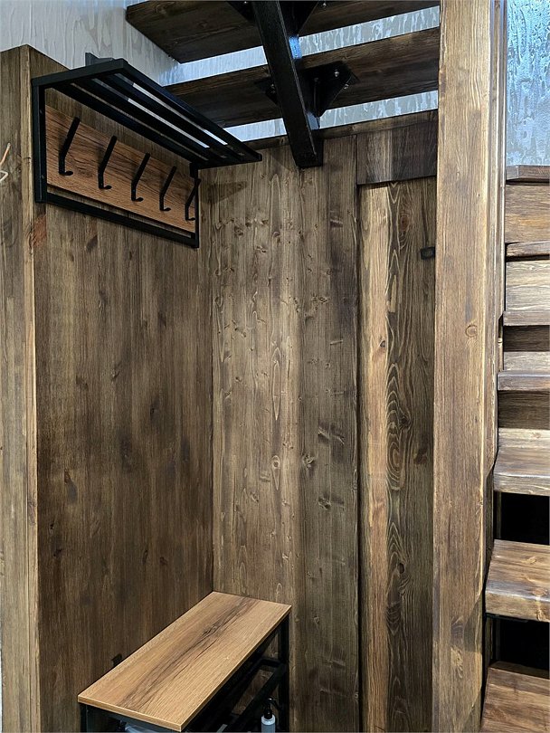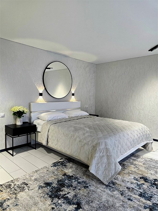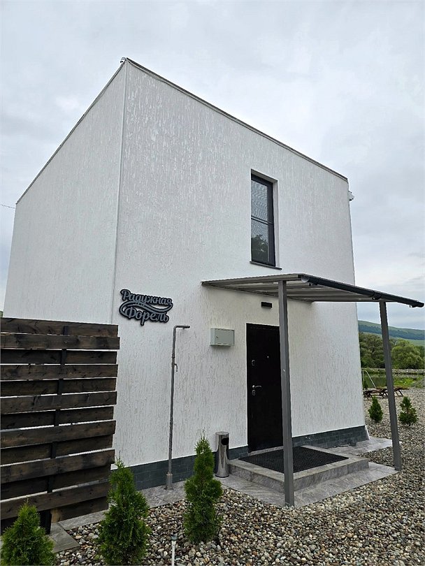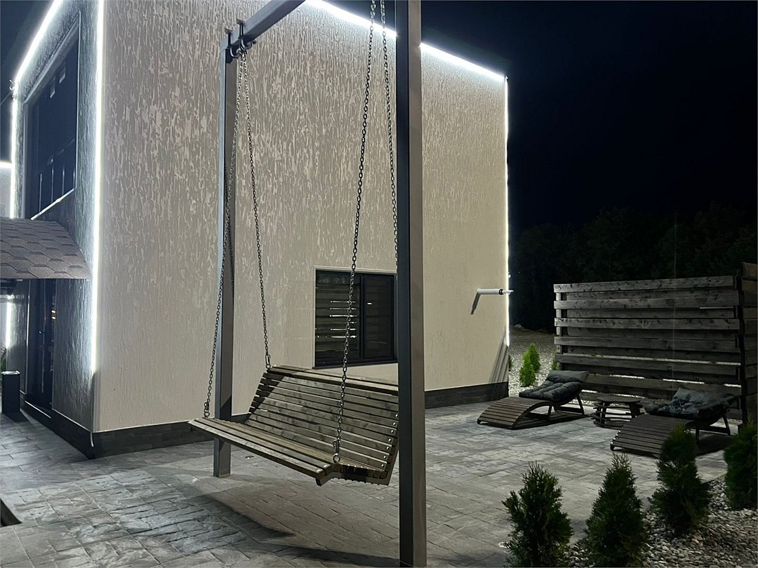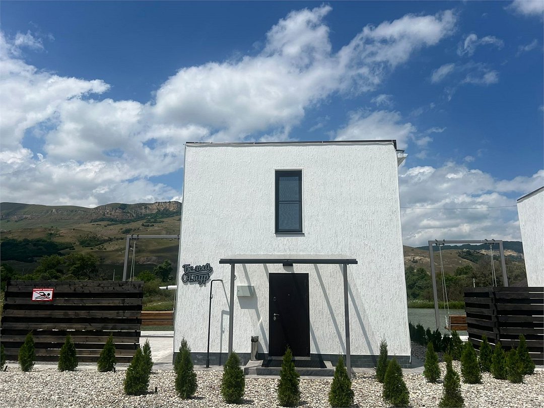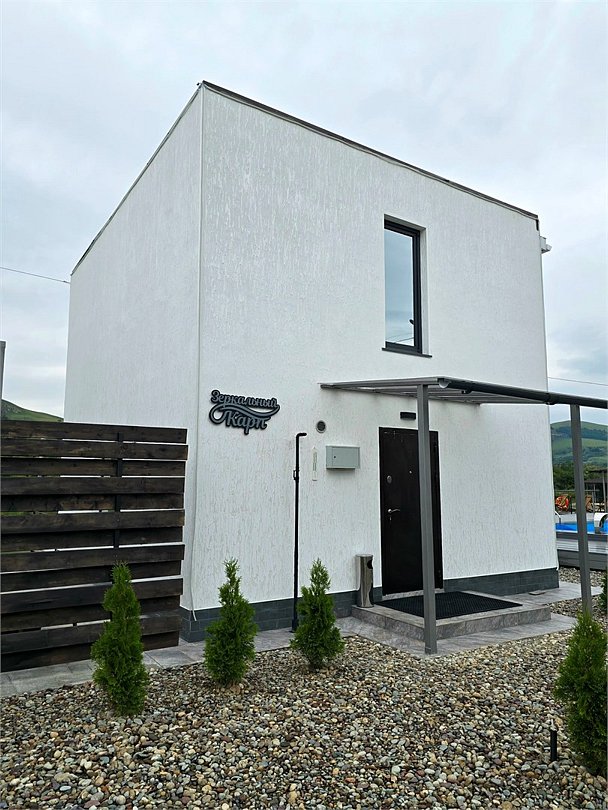 Двухэтажный дом площадью 70 кв. м. выполнен в современной стиле из качественных и экологичных материалов. На первом этаже расположены гостиная с большим раскладным диваном, кухонная и обеденная зоны, душевая кабина и раздельный санузел. Прямо из гостиной есть выход на большую террасу над прудом, где обустроена мангальная зона с необходимой посудой и принадлежностями. Здесь же для удобства гостей зона отдыха с шезлонгами и столиком, а также зона купания с отдельным входом в пруд. На втором этаже спальная комната с большой двухспальной кроватью и раскладным креслом, которую при желании можно использовать как дополнительное место. Рядом со спальней также есть свой санузел. На обеих этажах есть телевизоры со smart- телевидением, домик оснащен системой «теплый пол».Услуги и удобства