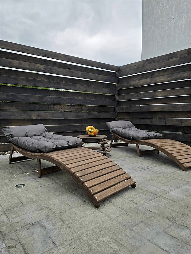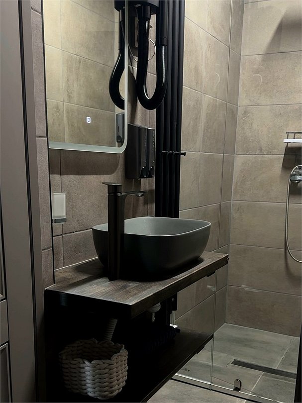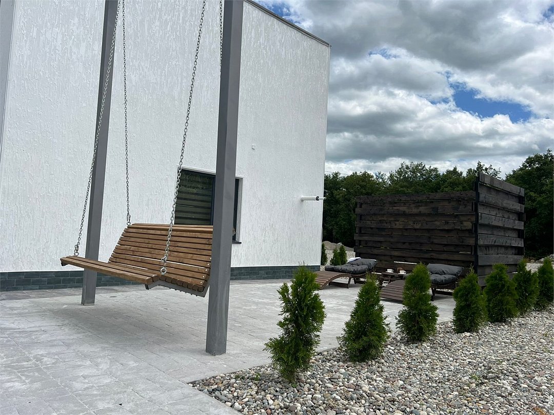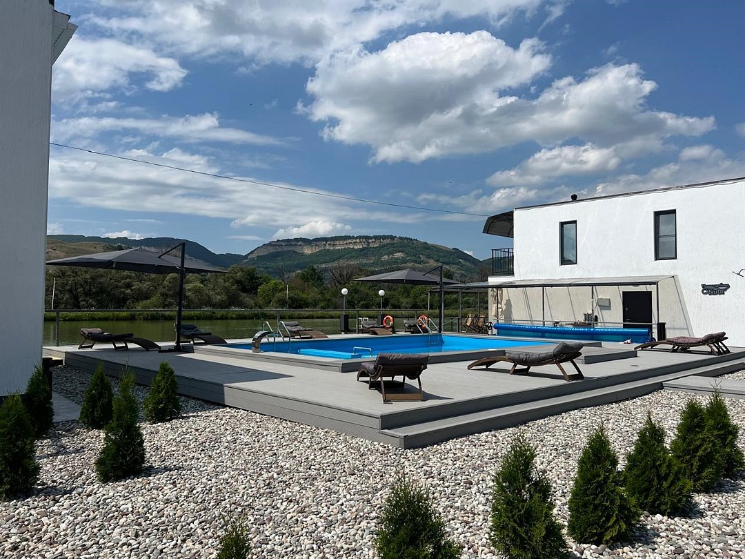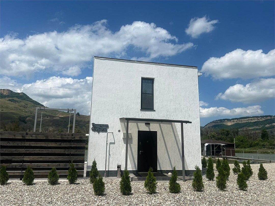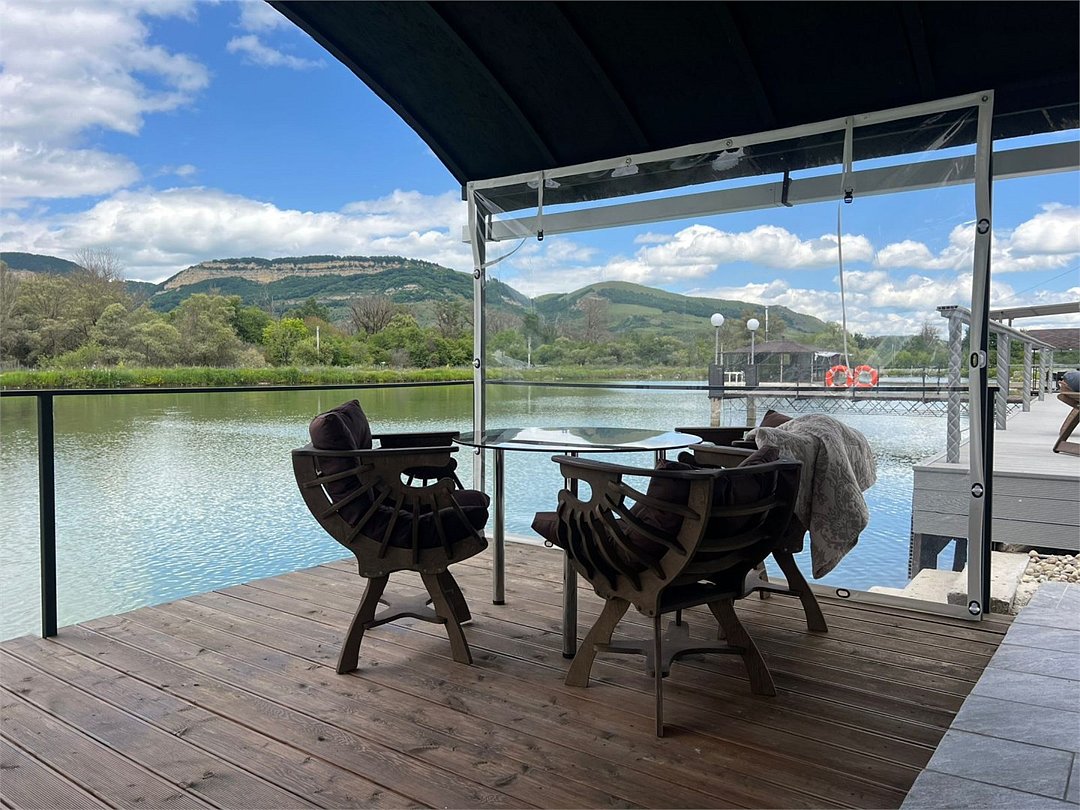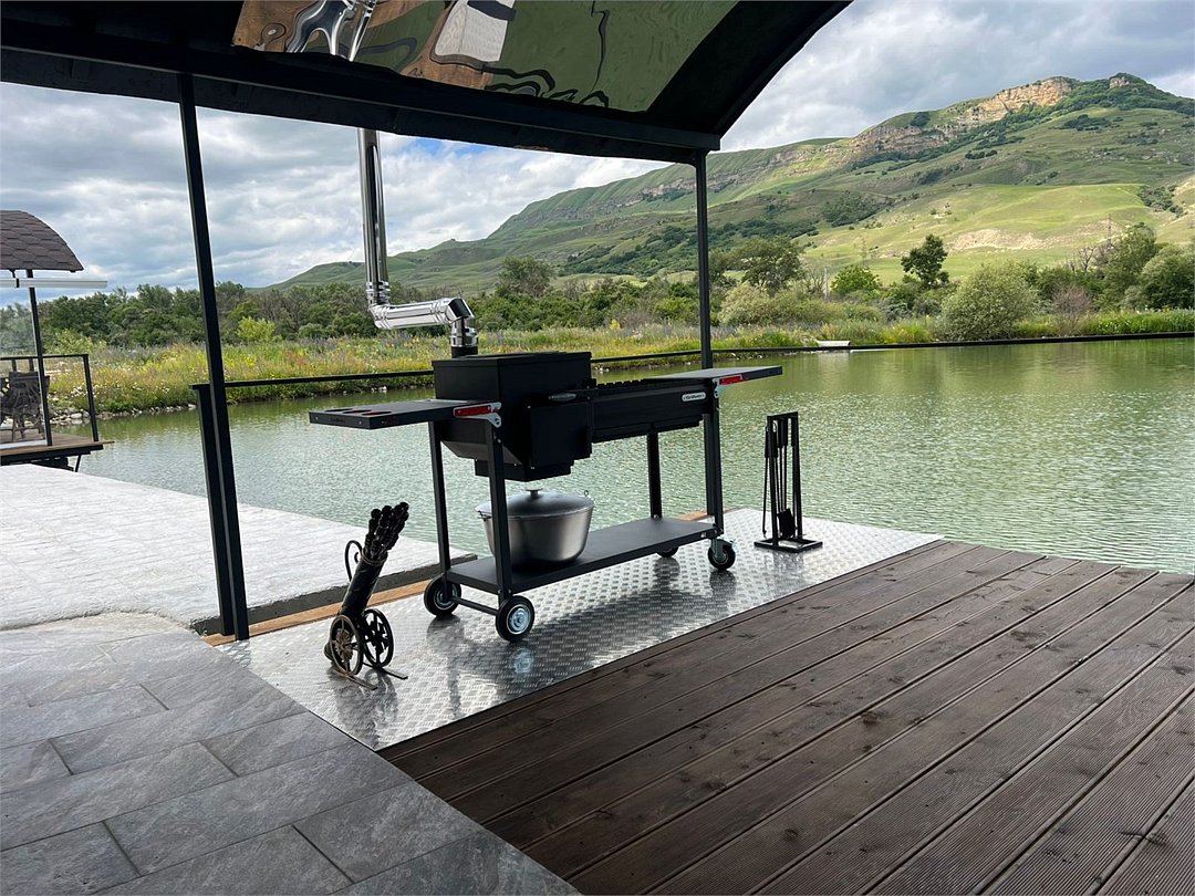 Двухэтажный дом площадью 70 кв. м. выполнен в современной стиле из качественных и экологичных материалов. На первом этаже расположены гостиная с большим раскладным диваном, кухонная и обеденная зоны, душевая кабина и санузел. Прямо из гостиной есть выход на большую террасу над прудом, где обустроена мангальная зона с необходимой посудой и принадлежностями. Здесь же для удобства гостей зона отдыха с шезлонгами и столиком, а также зона купания с отдельным входом в пруд. На втором этаже спальная комната с большой двухспальной кроватью и раскладным креслом, которую при желании можно использовать как дополнительное место. Рядом со спальней также есть свой санузел. На обеих этажах есть телевизоры со smart- телевидением, домик оснащен системой «теплый пол». Площадь домика позволяет вместить компанию или семью до 7-8 человек.Услуги и удобства