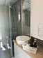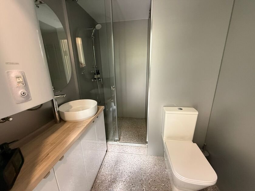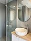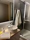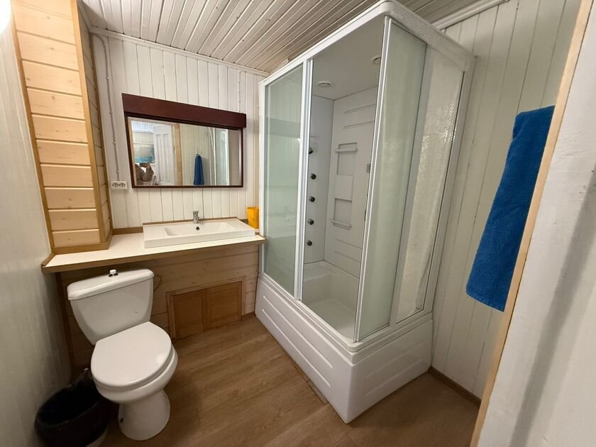Санузел с душевой кабиной и современной сантехникой. В тамбуре-прихожей есть шкафы для верхней одежды и дополнительные места для хранения.