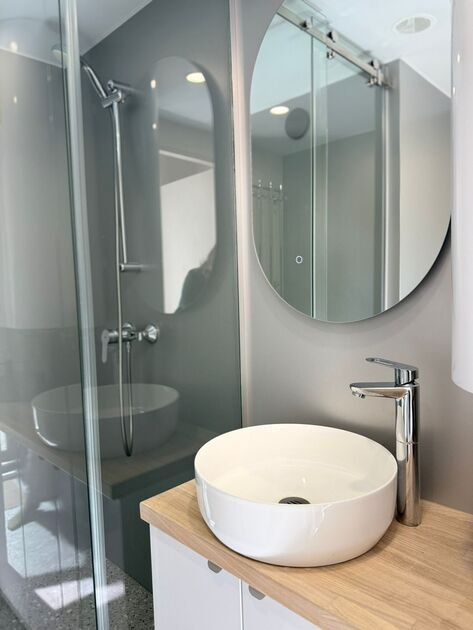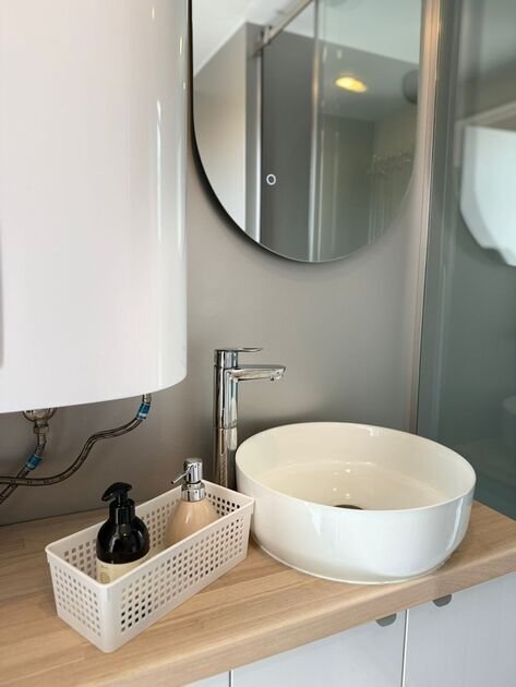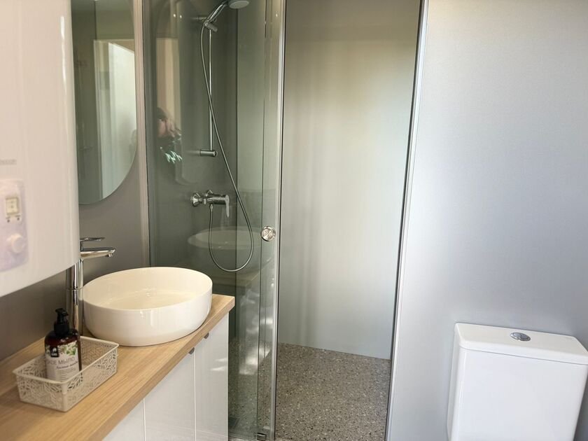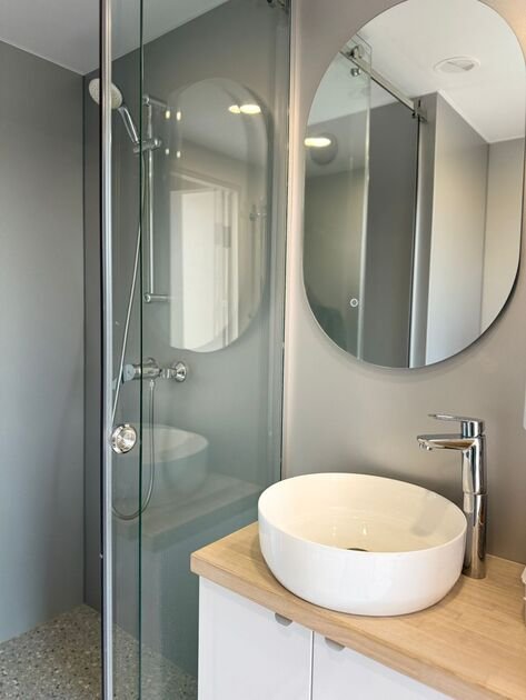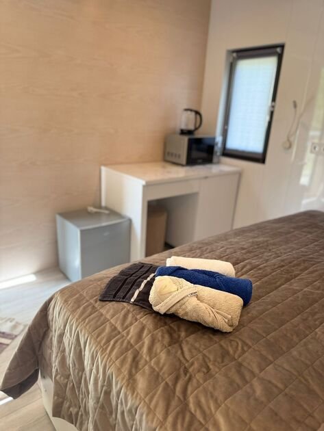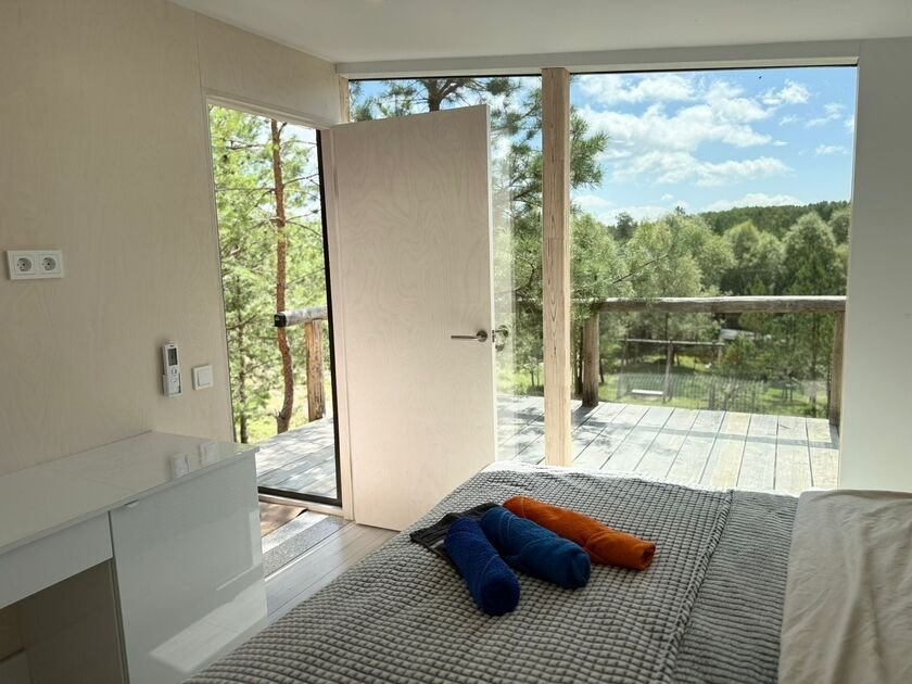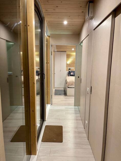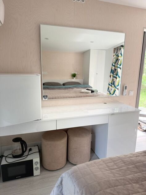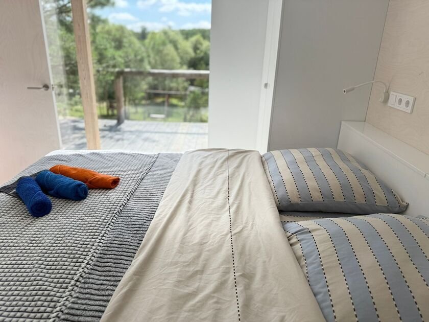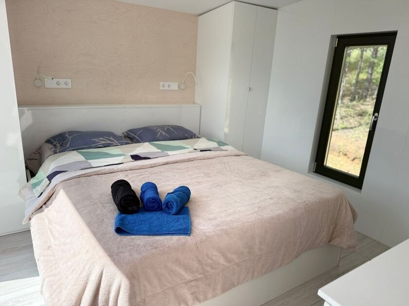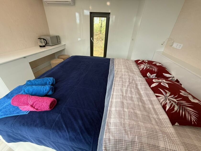 Глэмпинг №3 с двумя отдельными входами и двумя спальнями с удобными кроватями и матрасами ASKONA. Полноценный санузел с душевой кабиной и всей необходимой сантехникой. Тамбур-прихожая оборудована открытым шкафом для хранения верхней одежды и обуви, что добавляет удобства в повседневной жизни.