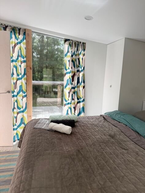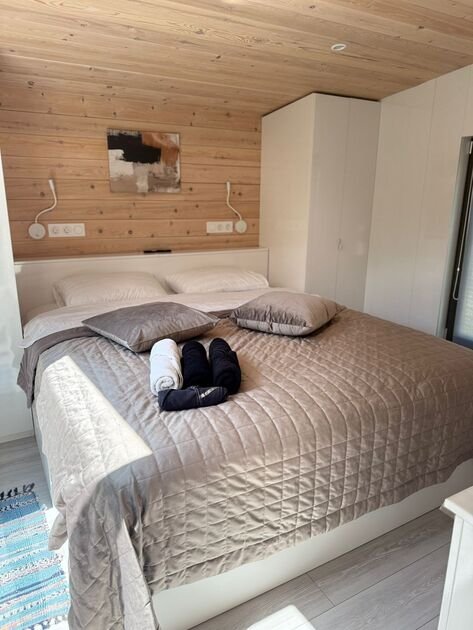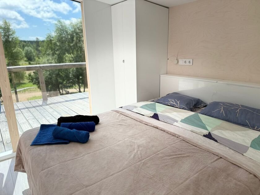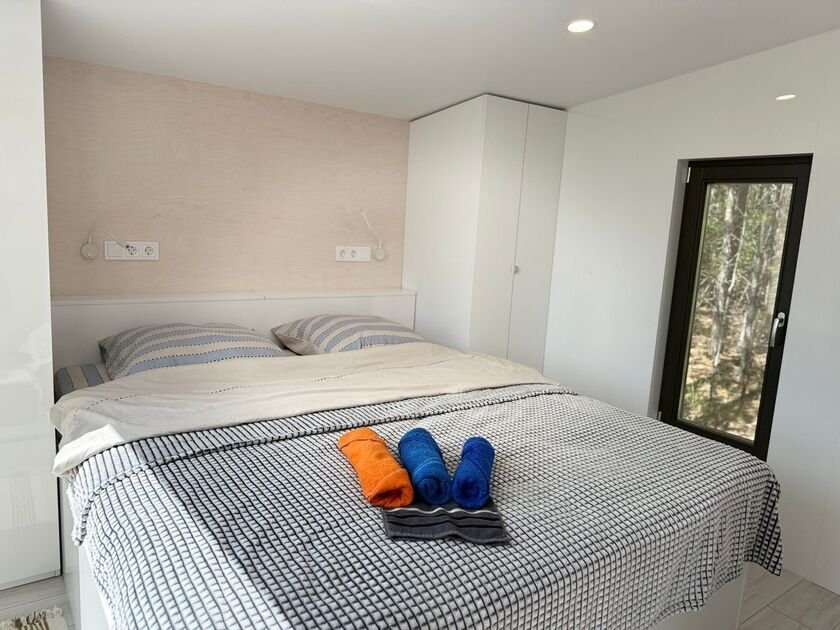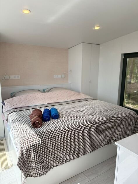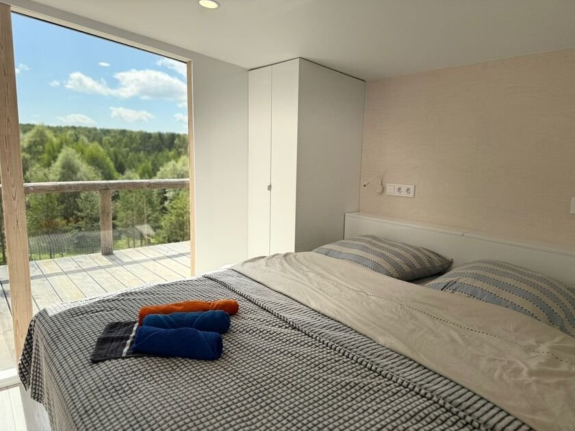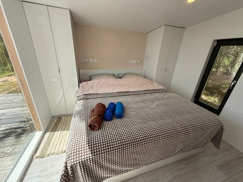 Глэмпинг — идеальное место для отдыха. Здесь есть уютная спальня с удобной двуспальной кроватью и матрасом ASKONA. В доме предусмотрен полноценный санузел с душевой кабиной. В тамбуре-прихожей расположен открытый шкаф, где хранятся верхняя одежда и обувь.