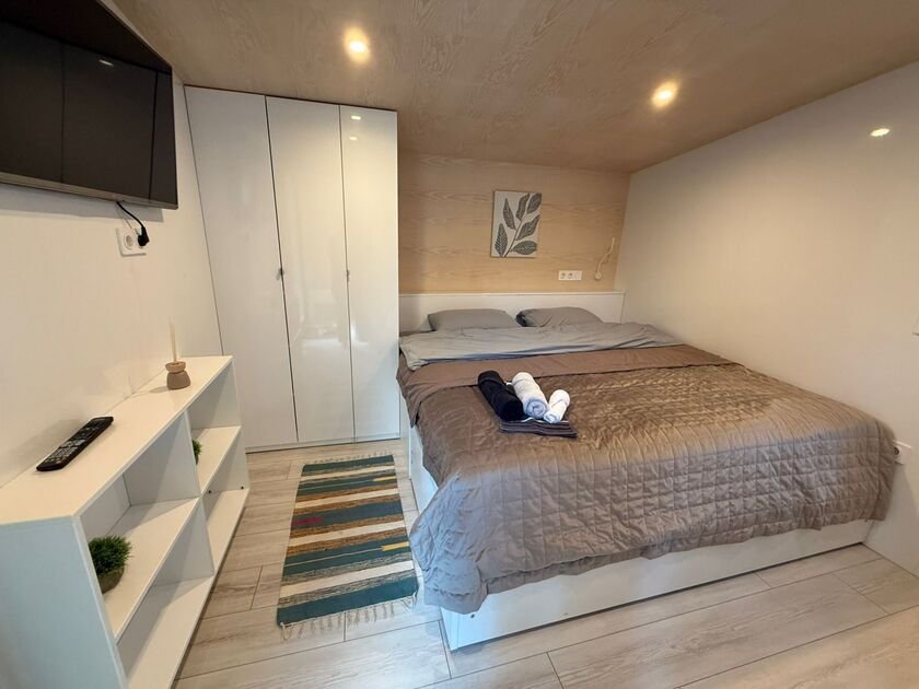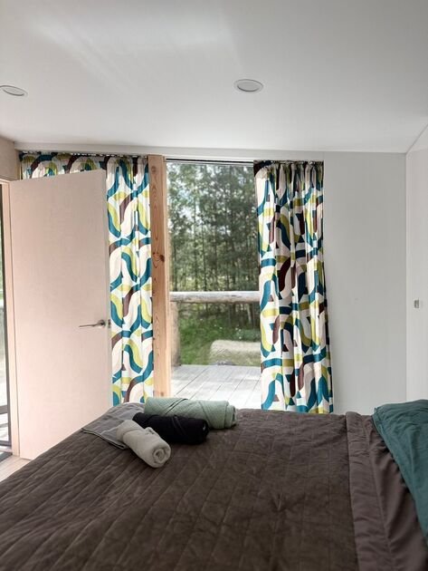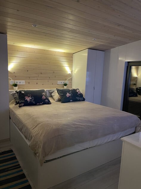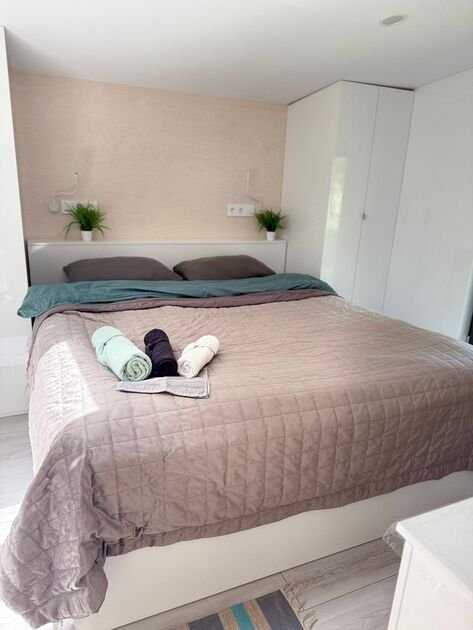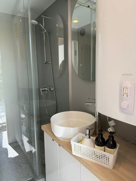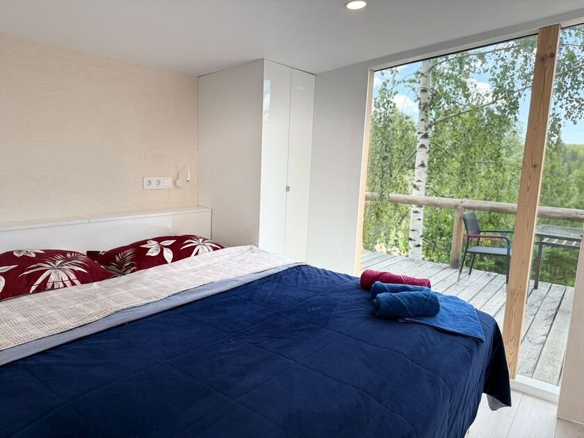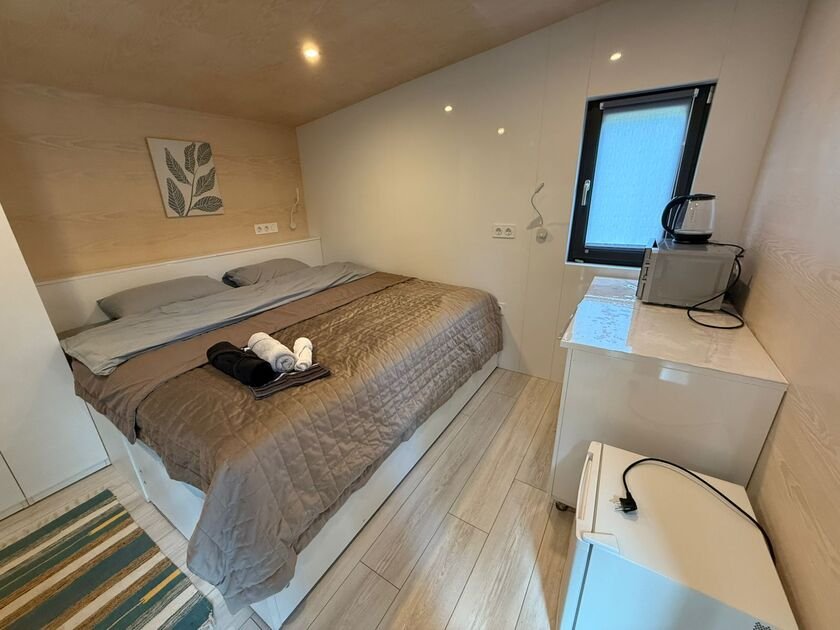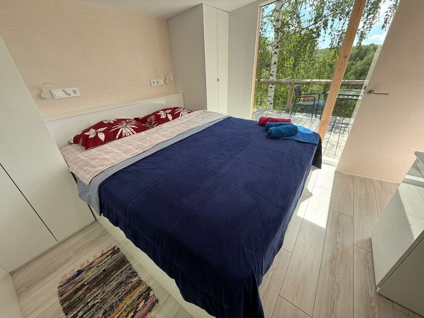 Глэмпинг — идеальное место для отдыха. Здесь есть уютная спальня с удобной двуспальной кроватью и матрасом ASKONA. В доме предусмотрен полноценный санузел с душевой кабиной. В тамбуре-прихожей расположен открытый шкаф, где хранятся верхняя одежда и обувь.