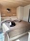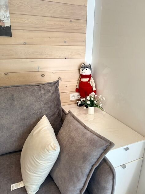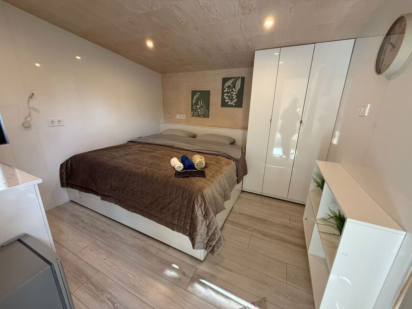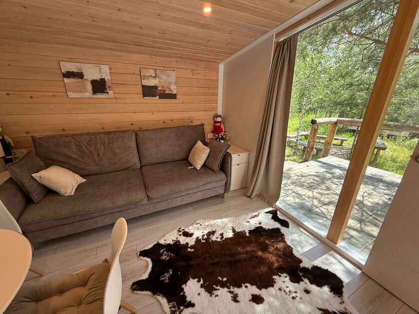 Глэмпинг №1 идеально подходит для комфортного проживания четырех человек. В спальне — удобная двухместная кровать с матрасом ASKONA. Гостиная-студия оснащена раскладным диваном и обеденным столом. Кухня полностью оборудована варочной поверхностью.