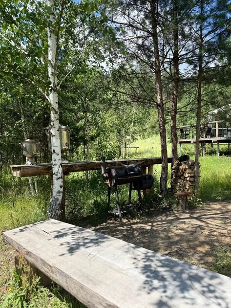 На территории клуба есть большой арочный шатер, где современный комфорт сочетается с природными видами, обеспечивая незабываемую атмосферу, а также игровые зоны, террасы, костровые зоны для вечернего отдыха.