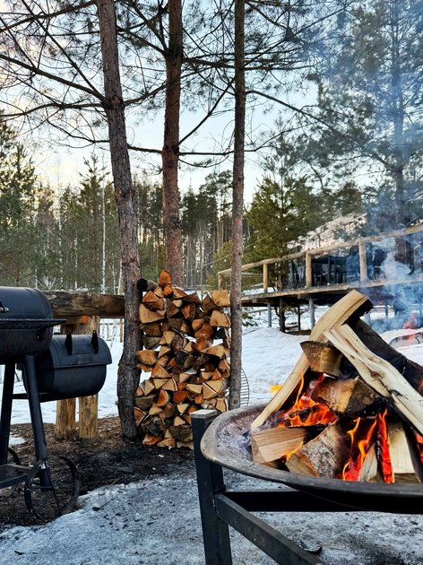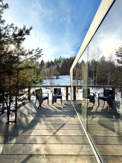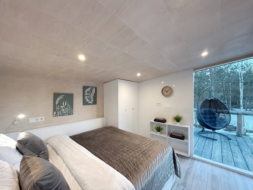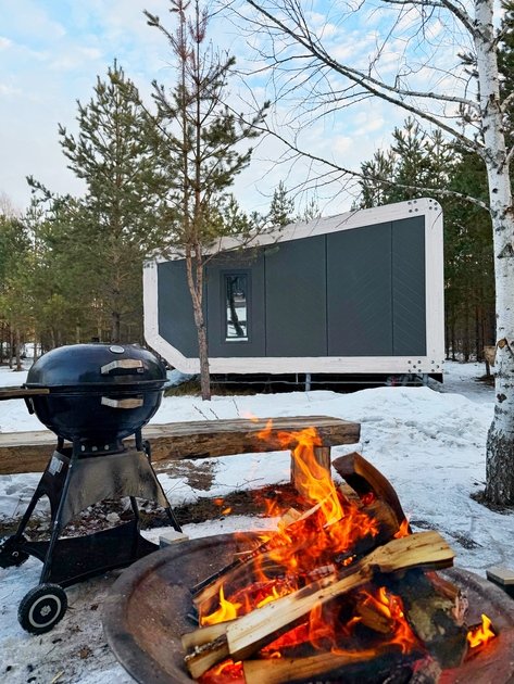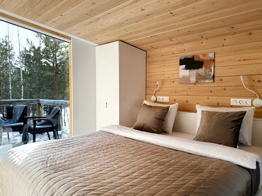 Уютный современный дом Double с панорамными окнами и красивым видом на лес рассчитан на двух гостей. У дома собственная терраса со столом и стульями из ротанга, имеется мангальная зона под открытым небом с общим доступом.