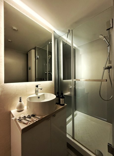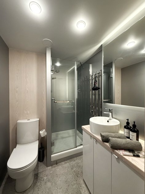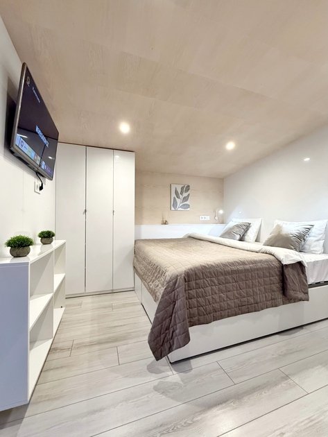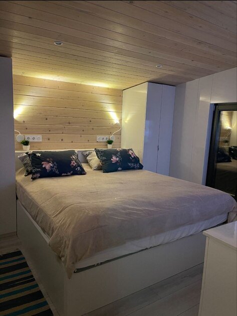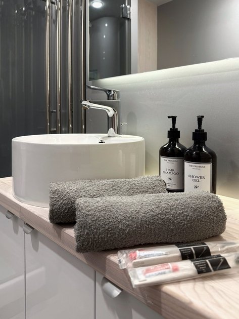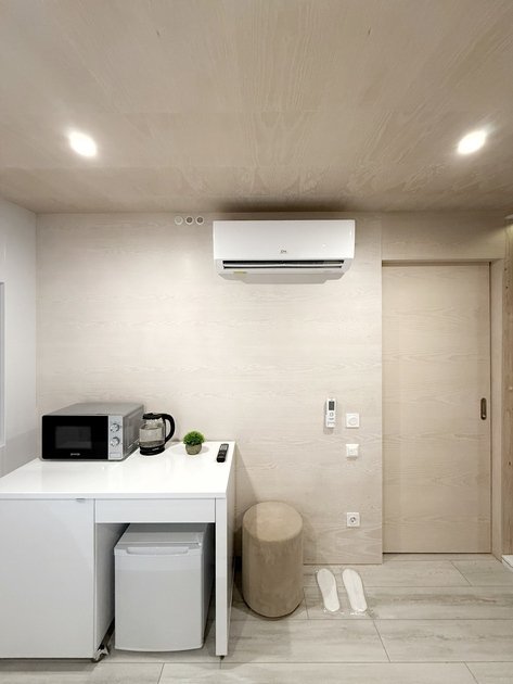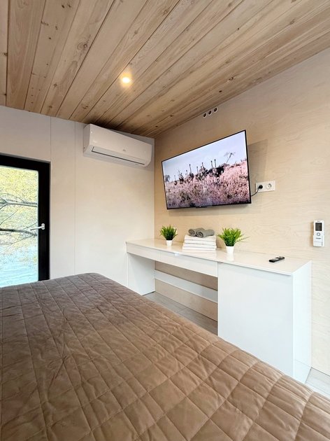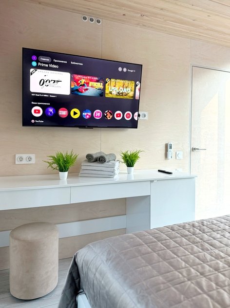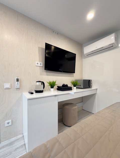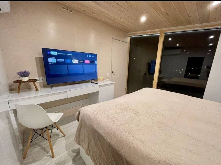 Удобства: Wi-Fi, Smart TV, кондиционер, холодильник, набор необходимой посуды, двуспальная кровать King size с ортопедическим матрасом, электрический чайник, микроволновая печь, одноразовый зубной набор, тапочки, махровые полотенца, средства личной гигиены, плотные шторы.