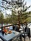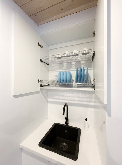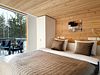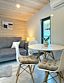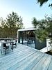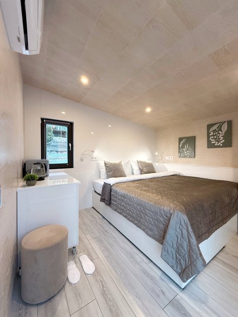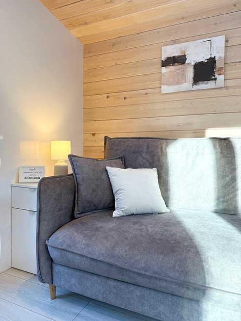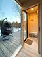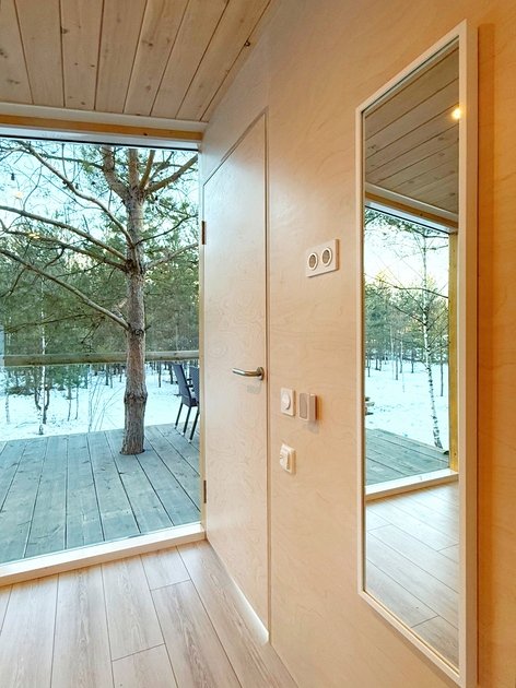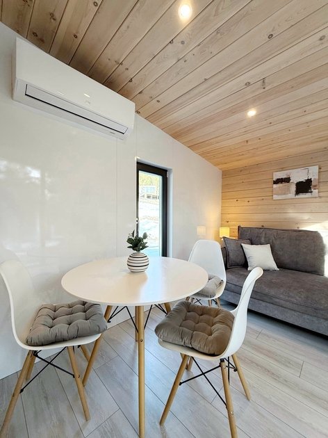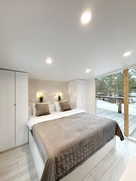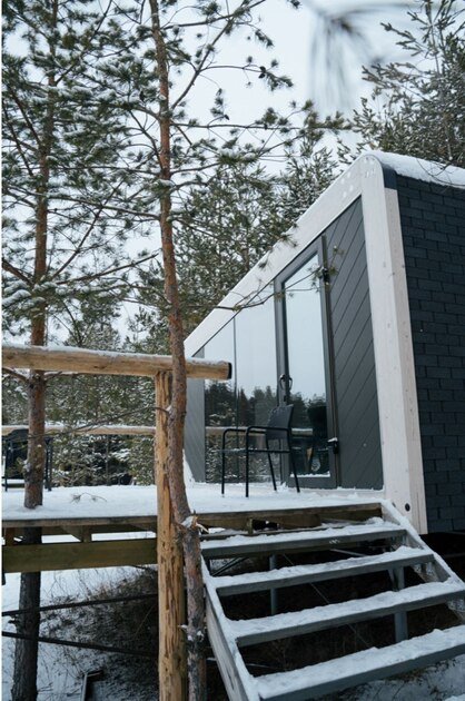 Ультра современный дом XL с панорамными окнами и красивым видом на лес. Рассчитан на четырех гостей. Состоит из спальни и гостиной с диваном, оснащен собственной кухней и совмещенным санузлом с просторной душевой кабиной.