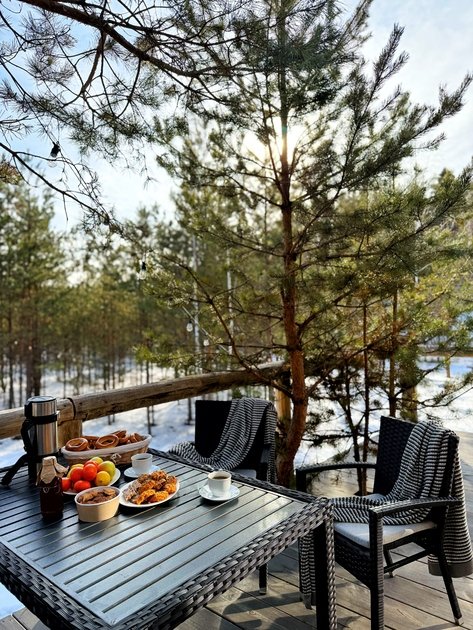 Уютный современный дом Double с панорамными окнами и красивым видом на лес. Рассчитан на двух гостей. У дома собственная терраса со столом и стульями из ротанга, имеется мангальная зона под открытым небом с общим доступом.