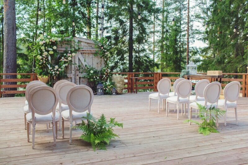 - каскадная терраса со спуском к песчаному берегу озера: на верхнем уровне можно оборудовать велком-зону для гостей, а на нижней — арку для выездной регистрации или декорации для торжественных моментов корпоративной вечеринки;