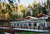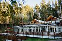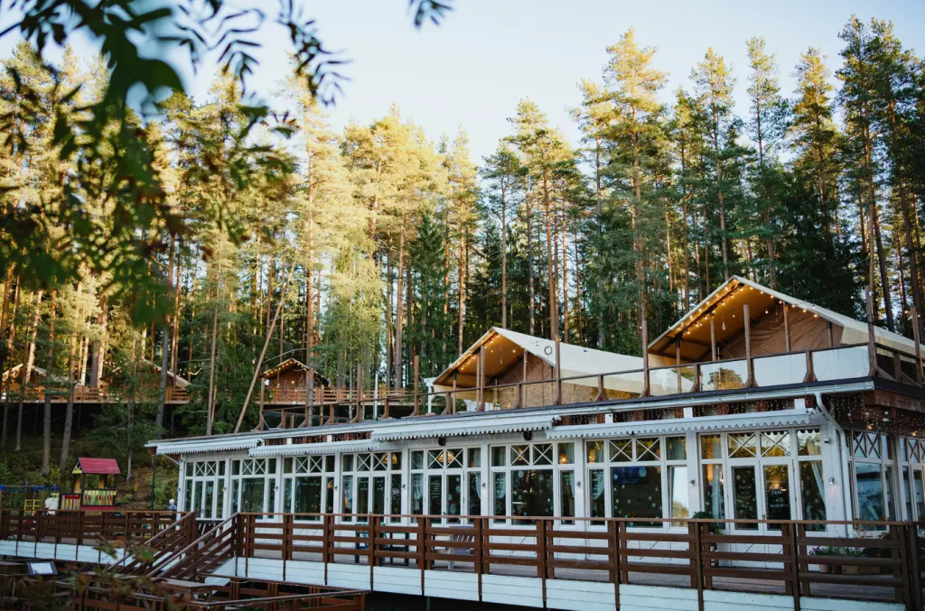 - панорамное остекление фасадной части зала с видом на озерную гладь, хвойный лес и старинную деревянную часовню;