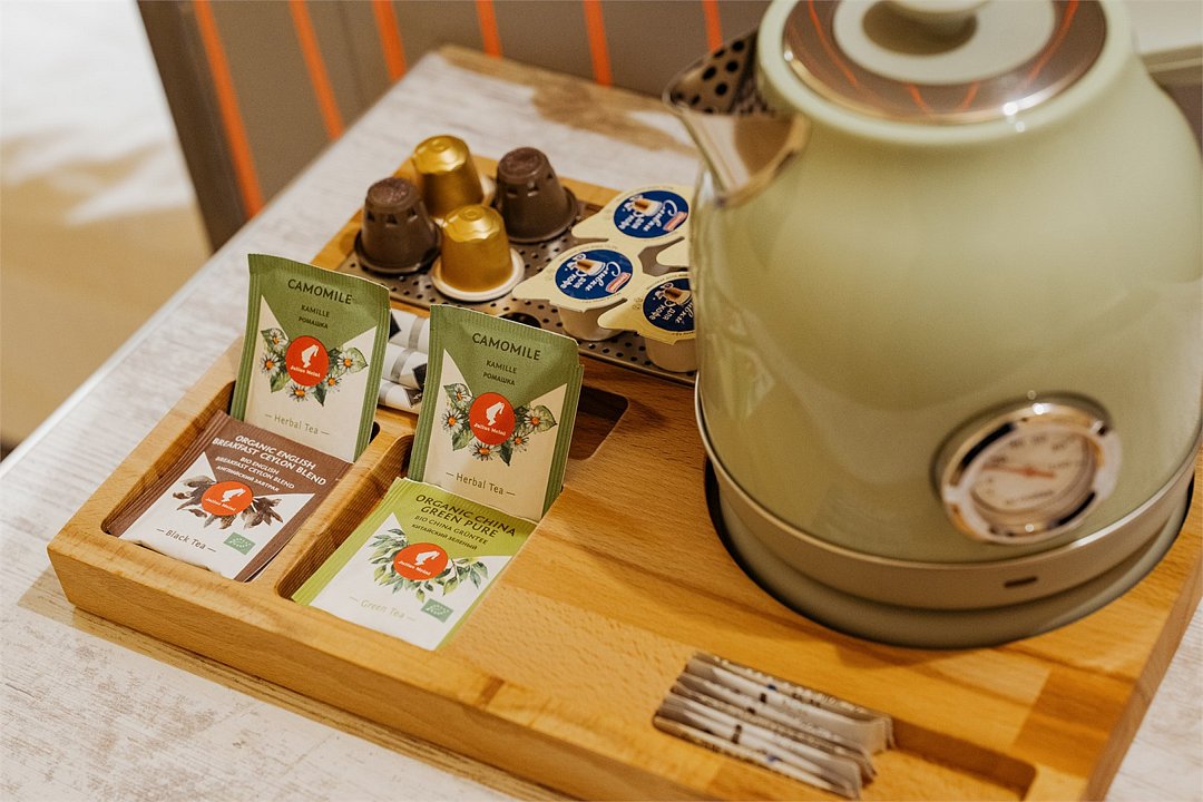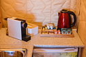 • мини кухня: раковина, чайно кофейная станция, посуда