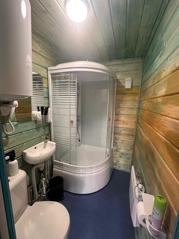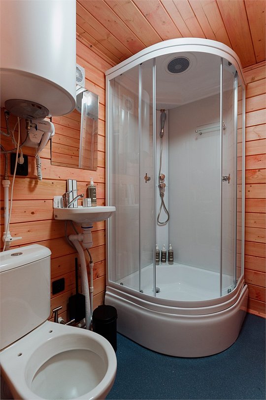 Внутри — king‑size кровать, тёплый пол, санузел и кухонный уголок. Снаружи — собственная терраса, купель( 1 топка купели входит в пакет проживания от 2-х ночей), мангальная зона и вид на сосновый лес