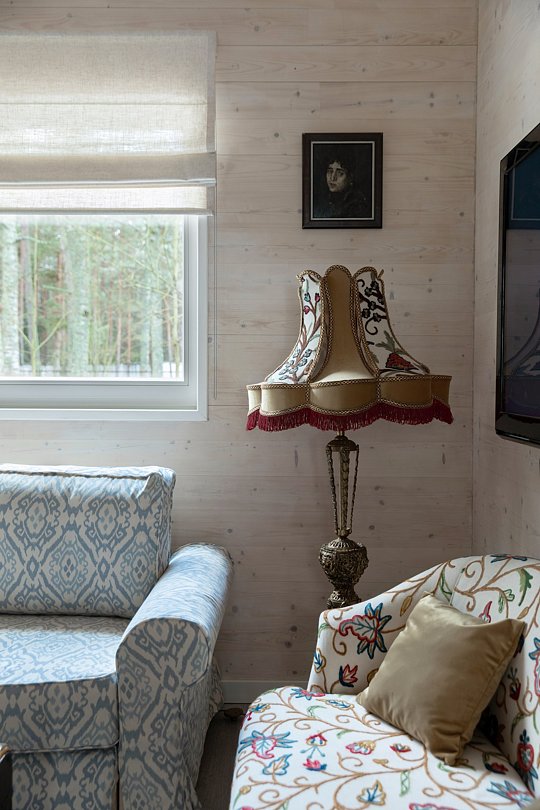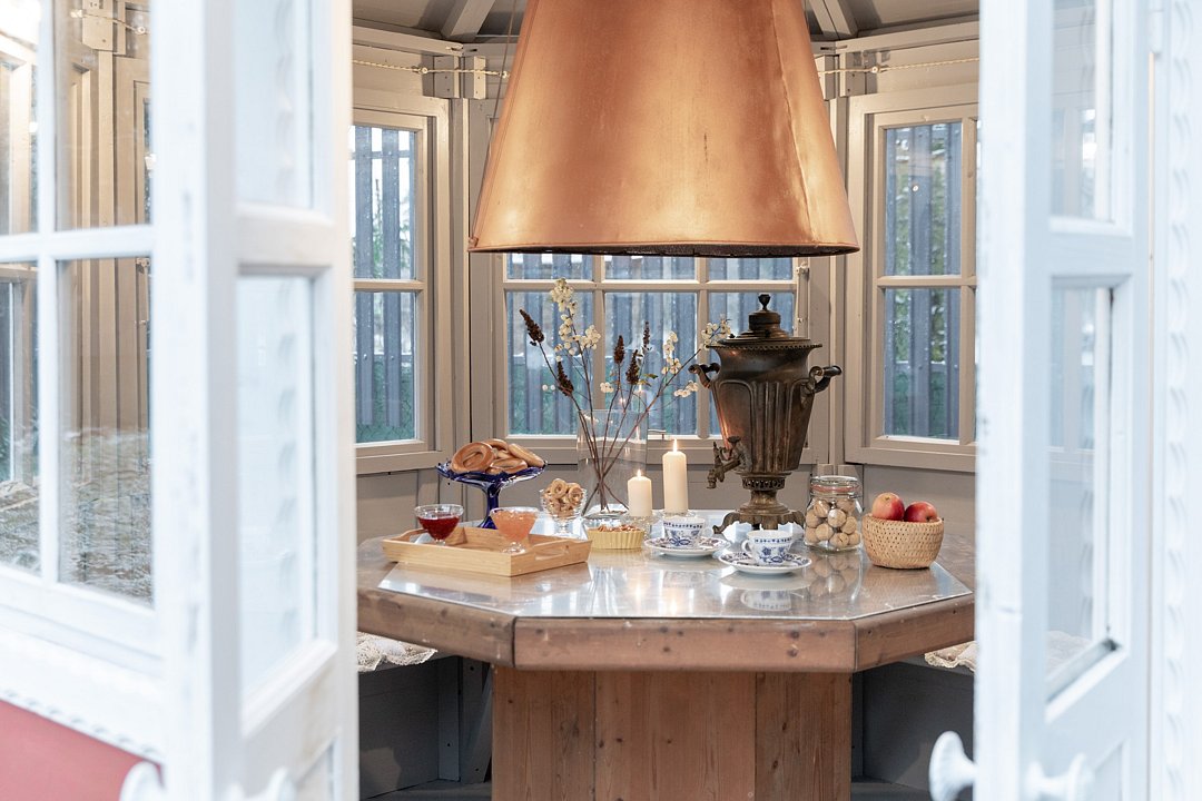 Внутреннее убранство поражает коллекционным антиквариатом, натуральным деревом и тёплым освещением. Здесь царит атмосфера настоящей дачной романтики, уединения и покоя, несмотря на расположение в городской черте, близко к центру Зеленогорска.