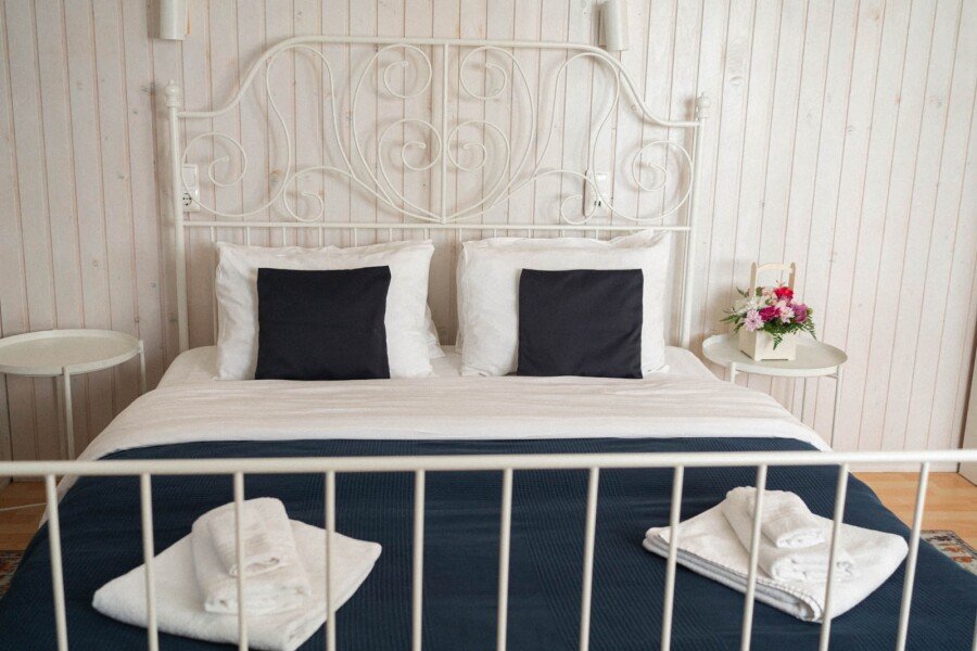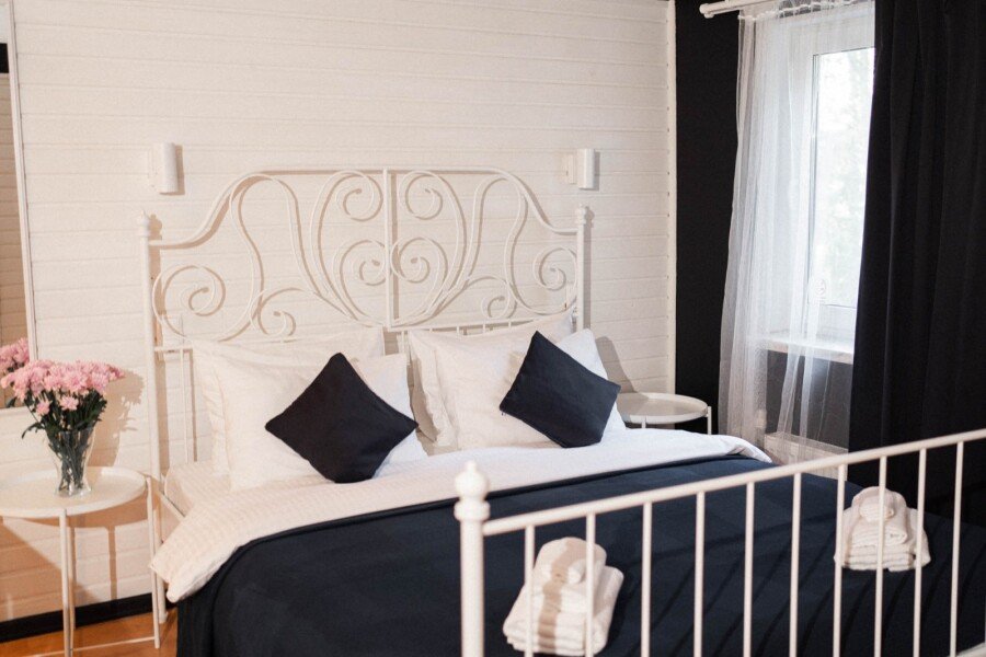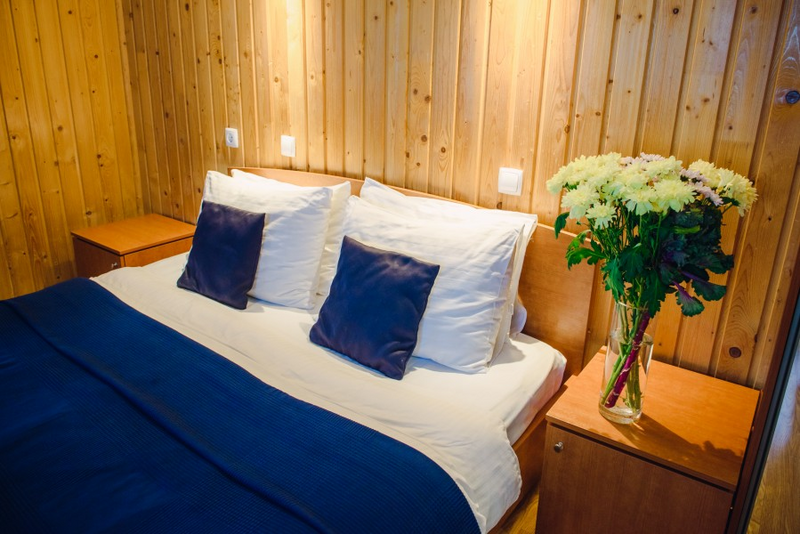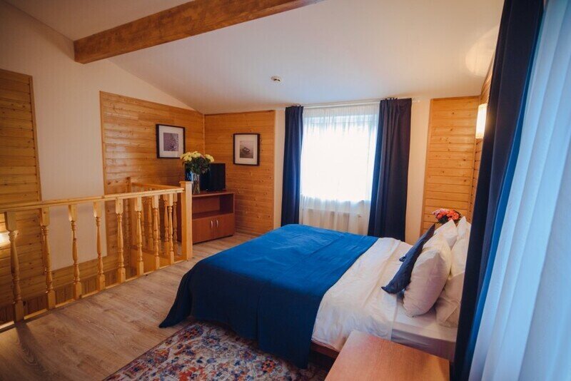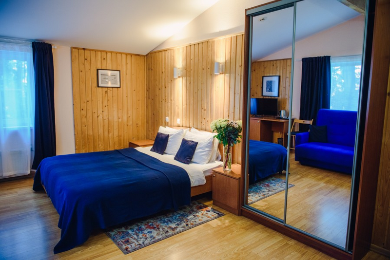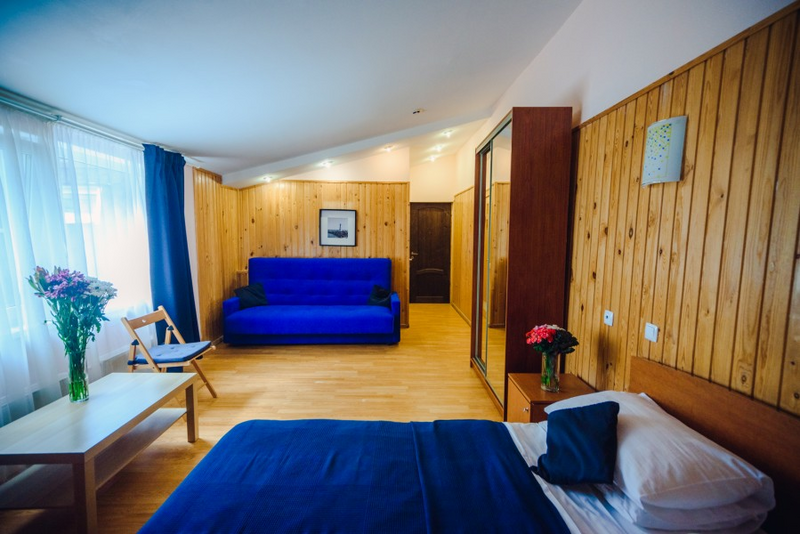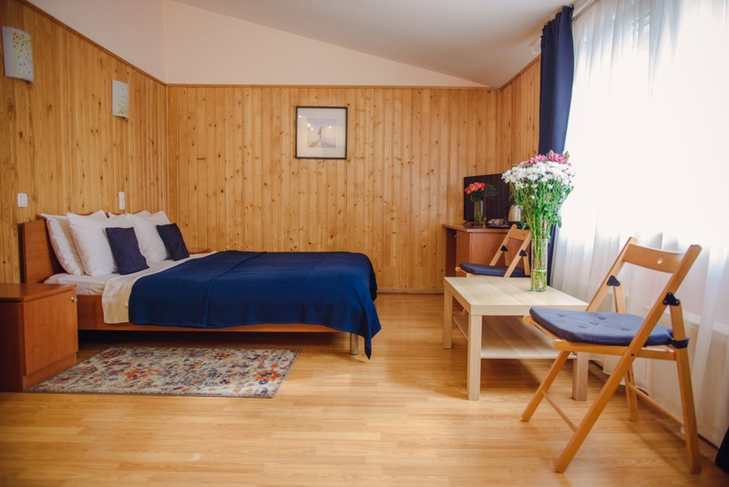 В отеле есть два типа номеров: «Стандарт» и «Полулюкс». Номера «Полулюкс» имеют два этажа, отдельный вход и веранду. В каждом номере, независимо от типа, есть все необходимое для удобного проживания: двуспальная кровать, диван, шкаф, холодильник, телевизор, интернет, душ и туалет. В отеле также есть ресторан, где вы можете насладиться разнообразными блюдами и напитками.