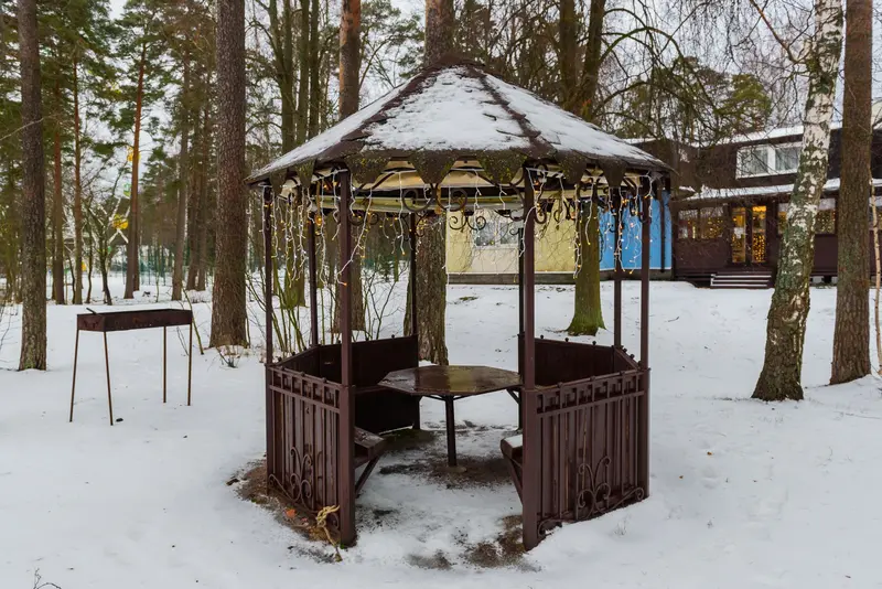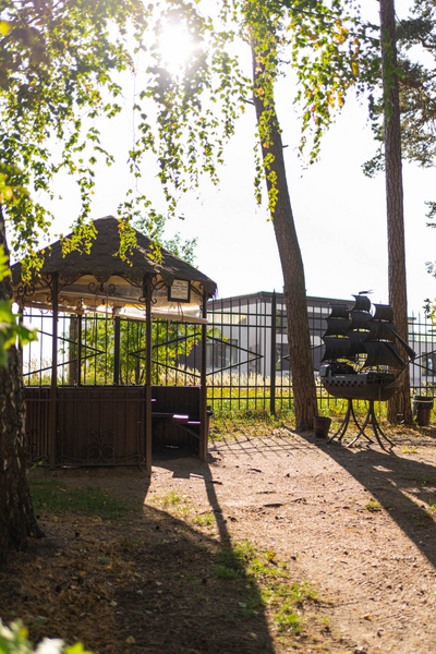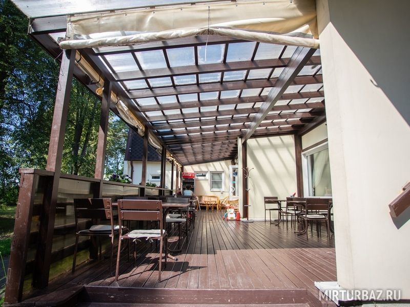 Место, где гости могут отдохнуть, разделено на три зоны: главное помещение – ресторан (банкетный зал), открытая площадка (работает в теплое время года) с навесами и бар.