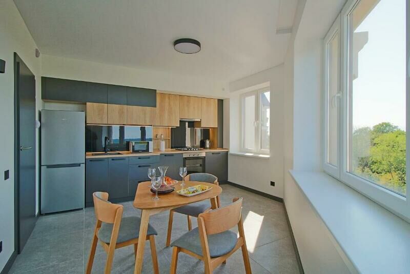 Апартаменты находятся в современном многоэтажном здании, расположенном недалеко от живописного зеленого парка примерно в 500 метрах от побережья Балтийского моря. Комфортабельные однокомнатные и двухкомнатные номера рассчитаны на размещение от 2-х до 4-х гостей. В Апартаментах стильный интерьер, есть собственная, полностью оборудованная кухня, и ванная комната с душем. Среди бытовой техники также имеется стиральная машина и плазменный телевизор.