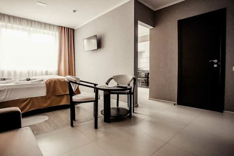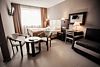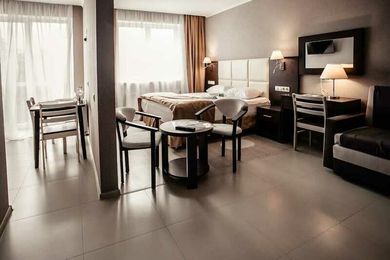 Гостиная с двуспальной кроватью или две односпальные (по запросу), кресло-кровать, телевизор, шкаф, подставка для багажа, стол, стулья, телевизор, тумбочки прикроватные, зеркало, электрический чайник, фен.