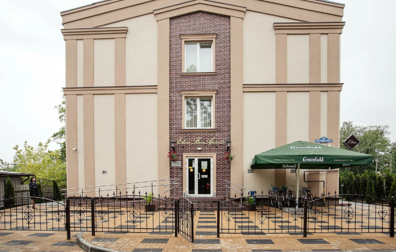 Трехэтажные апартаменты, рассчитанные на единовременное размещение 18 человек, предлагают отдыхающим комфортные номера, оснащенные мини-кухней, собственным санузлом с душем, качественным мебельным гарнитуром и необходимой бытовой техникой — телевизором, стиральной машиной, холодильником, электрической плитой.