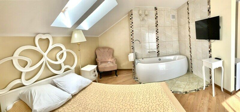 Санузел с ванной/душем, ТВ, мансардный потолок и окна