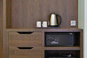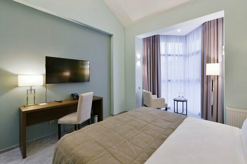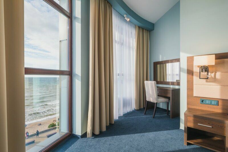Размещение. Приехали после обеда, уставшие (2 дня в дороге). На ресепшен выдали ключи, взяв паспорта для оформления документов, очень приятно не ждать формальные процедуры. Номер 303, делюкс с частичным видом на море. Самый приятный и удобный из современных номеров. Двуспальная кровать и диван раскладушка, сейф в столе. Стол не бросается в глаза, прозрачный холодильник, мягкий матрас. К ванной душ обычный и тропический с регулировкой не более 38 градусов. Ванная комната довольно большая, белоснежные полотенца и халаты, приятная косметика. Все новое. А какой вид на море из эркера за столиком… Неплохой спортзал, а вот бассейн в СПА надо было бы побольше поставить. Отель на первой линии выходишь и на променад, и по морю, метров 700 до центра - до Курортного бульвара.
