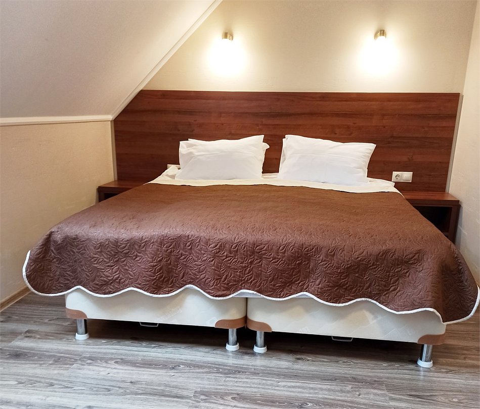 Большой семейный уютный номер, состоящий из двух комнат, разделенный небольшим холлом, каждая комната полностью оборудованна всем необходимым. Возможно размещение дополнительного спального места в виде еврораскладушки. В номере отдельный санузел с душем. Комнаты оснащены двумя телевизорами с плоским экраном, мини-холодильниками, электрическими чайниками, феном, постельным бельем, полотенцами, одноразовыми гелями и шампунями.Услуги и удобства