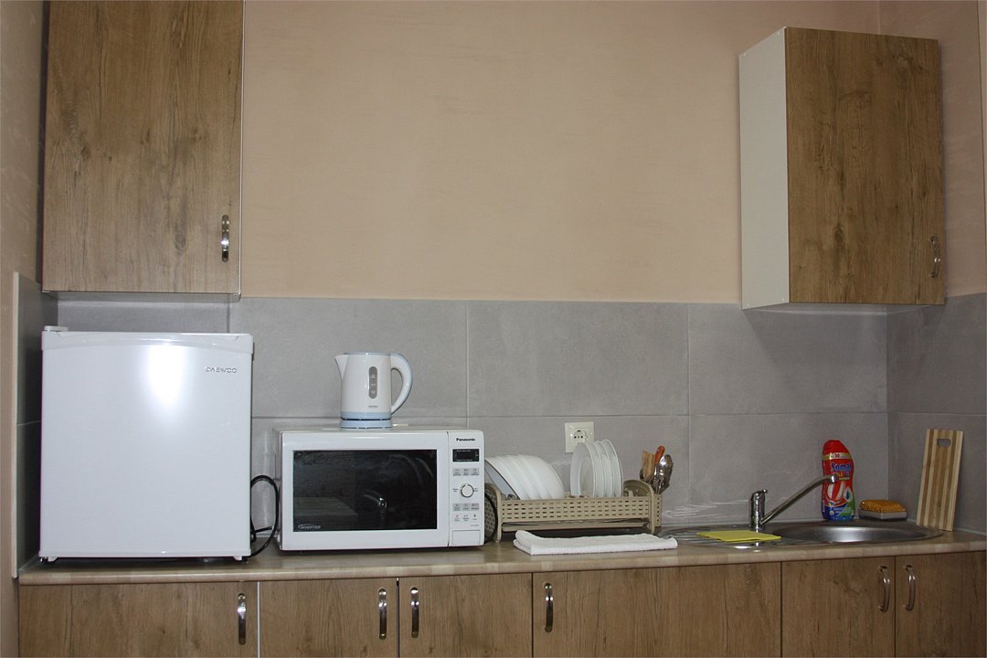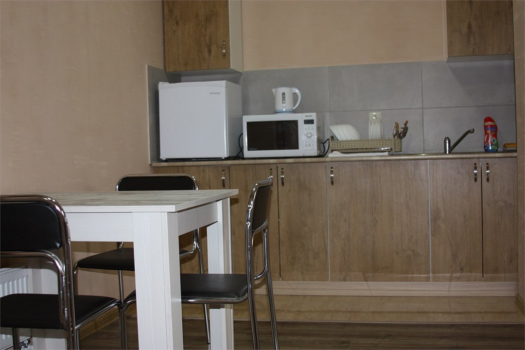 Уютный двухкомнатный номер с мини-кухней, полностью оборудованный всем необходимым. В номере отдельный санузел, душ. Комната оснащена телевизором с плоским экраном, феном, постельным бельем, полотенцами, одноразовыми гелями и шампунями. На кухне имеется обеденный стол, стулья, мини-холодильник, электрический чайник, микроволновая печь, посуда и столовые принадлежности, мойка для посуды.Услуги и удобства