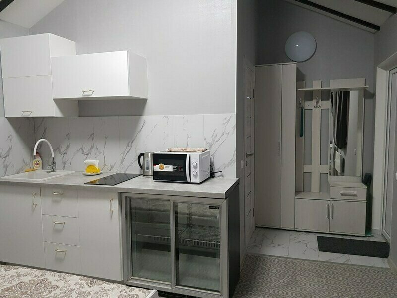Обеденная зона оснащена холодильником, микроволновой печью, набором посуды, электрическим чайником, плитой.
