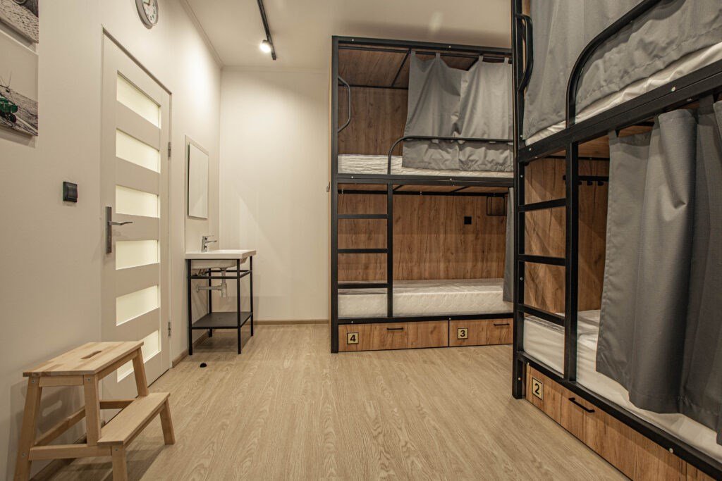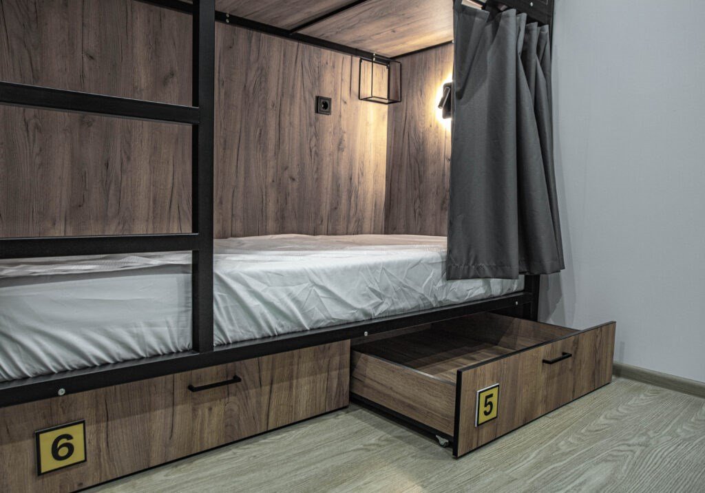 Две двухъярусные кровати капсульного типа, на надежном, усиленном металлическом каркасе, который выдерживает суммарный вес 300 кг. Персональный шкафчик оборудован полкой, для электронных девайсов, штангой для вешалок под одежду. На дверце надежный кодовый замок. Кровать оборудована шторкой, позволяющей создать личное пространство. Внутри светильник, розетка, полка под телефон, штанга для одежды. Дополнительное место для хранения личных вещей- выдвижной ящик под кроватью, где можно хранить сумки, чемоданы, обувь. Внутри номера установлен умывальник, чтобы помыть руки, фрукты, и прочее. Вам не нужно будет для этого выходить в общий санузел. Качественное белоснежное постельное белье категории Страйп-сатин 100% хлопок, которое будет радовать ваш сон, полотенца 2 шт.Услуги и удобства