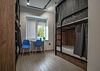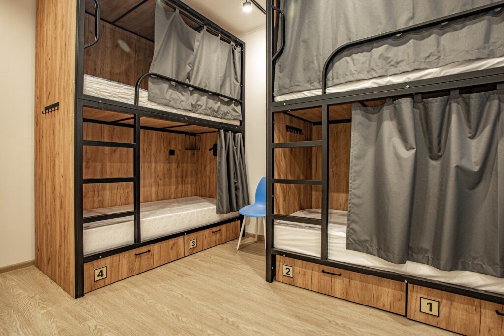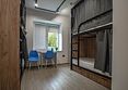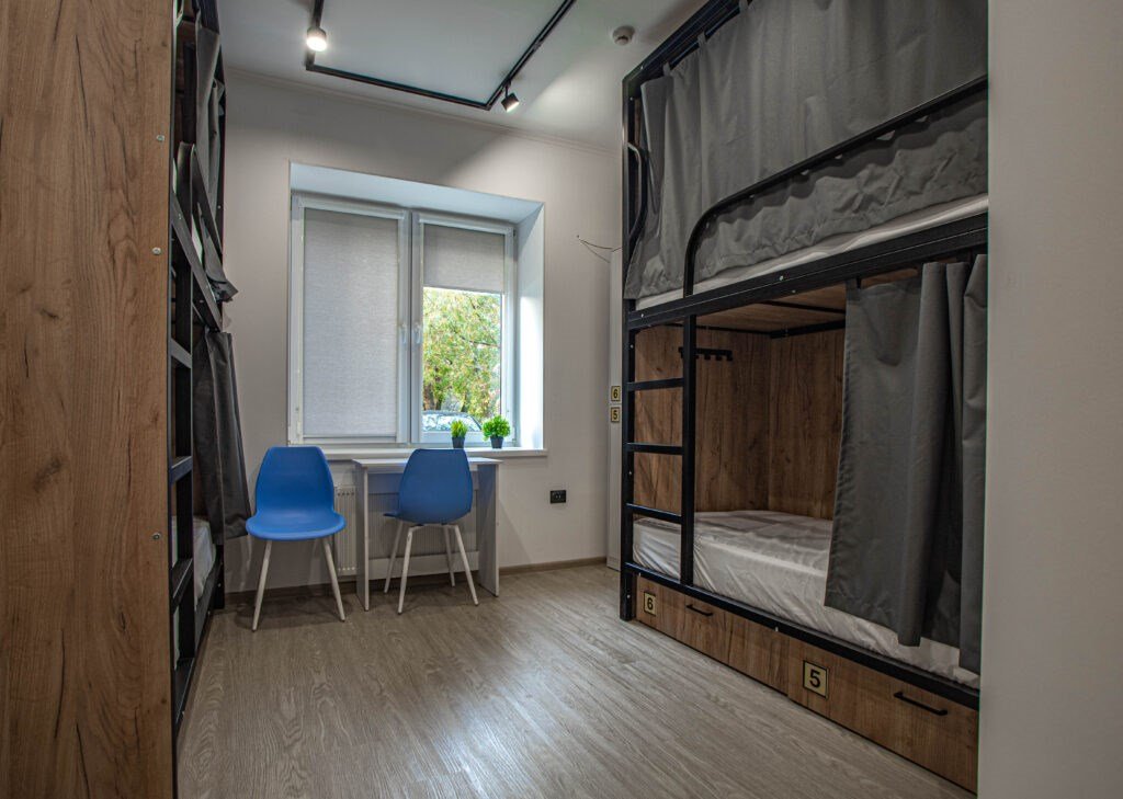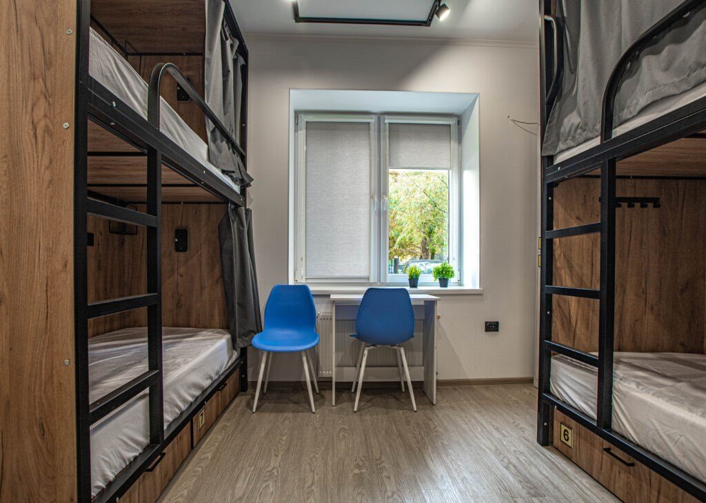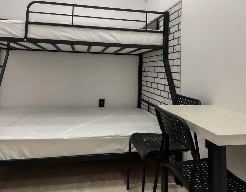 Двухъярусная кровать, на усиленном металлическом каркасе. Верхняя часть: 90 х 190 см. Нижняя часть: 120 х 190 см.Шкаф открытого типа, с полками, и вешалками для одежды. Внутри номера установлен умывальник, чтобы помыть руки, фрукты, и прочее. Вам не нужно будет для этого выходить в общий санузел. Качественное белоснежное постельное белье категории Страйп-сатин 100% хлопок, которое будет радовать ваш сон, полотенца 2 шт. Письменный столик. Два стула.Услуги и удобства