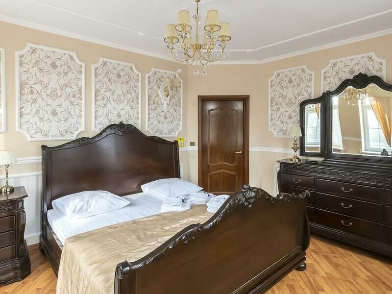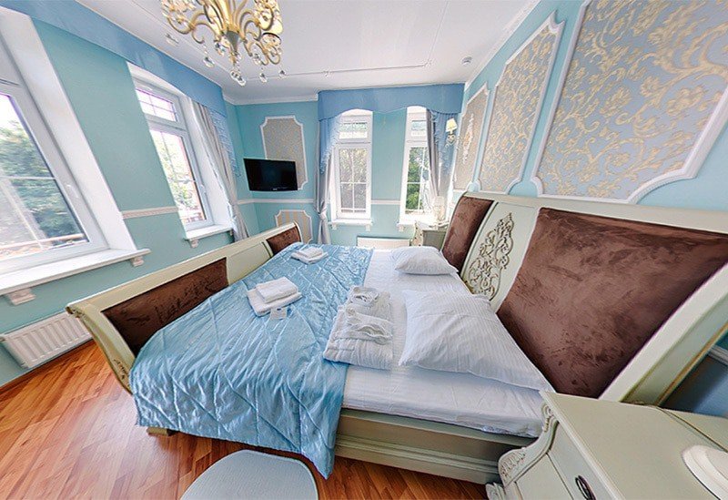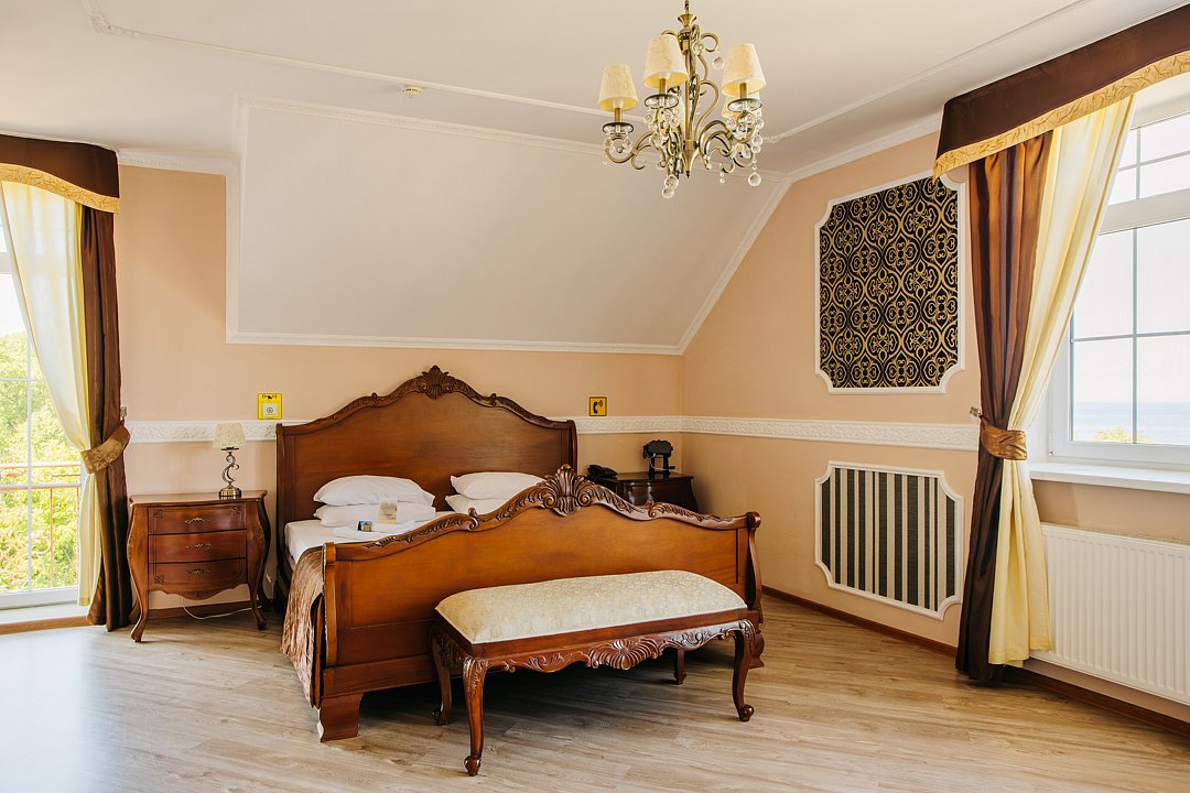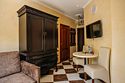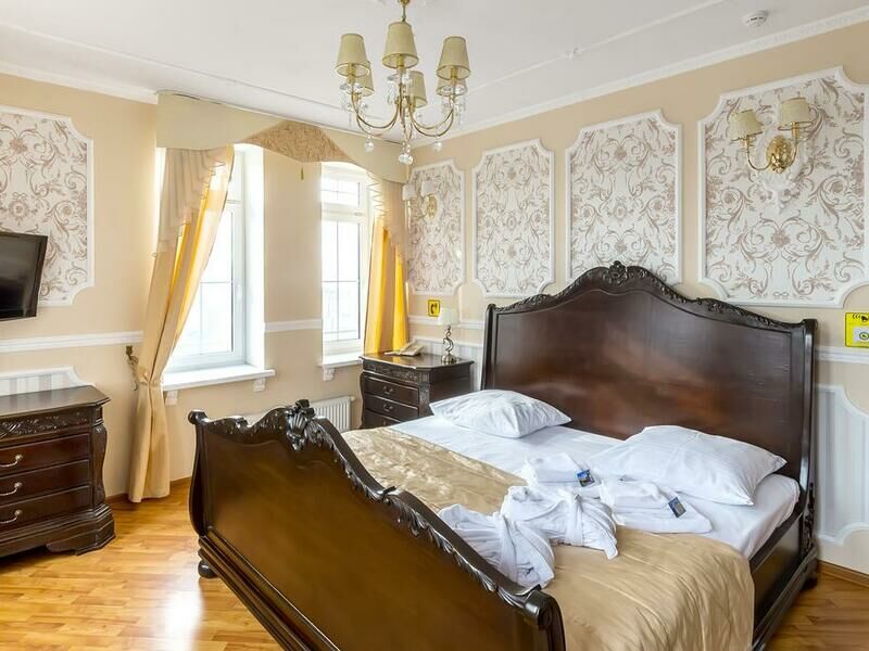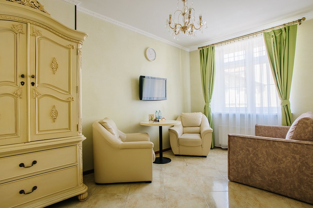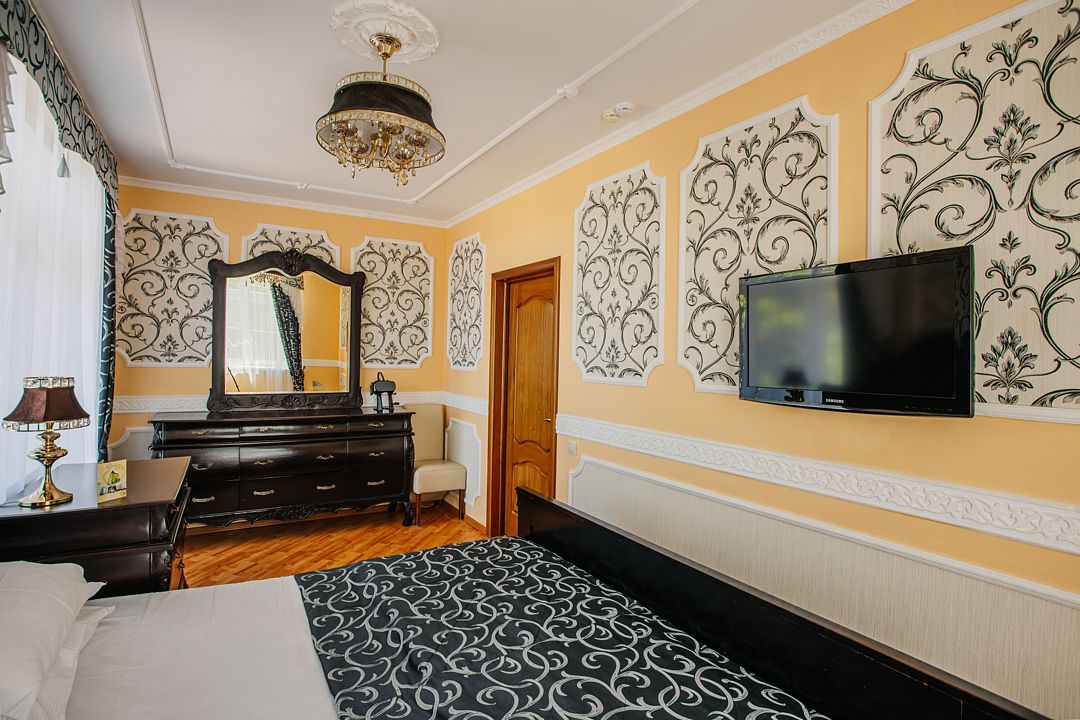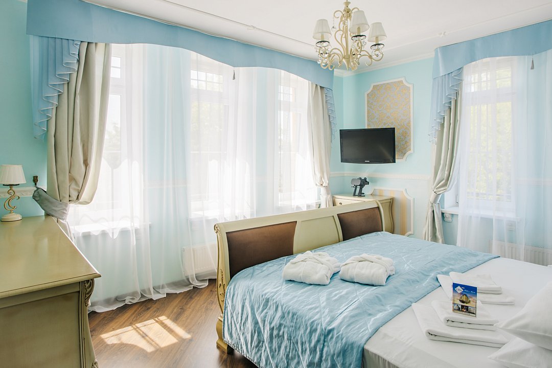 Делюкс - площадь номера от 35 кв.м. с одной двуспальной кроватью. Удобства номера: Гостиная-столовая с кухней: холодильник, плита, стол, стулья, диван, телевизор, посуда, чайный набор. Спальная комната: двуспальная кровать, комод/зеркало, шкаф, телевизор, кондиционер, отопление, телефон, сейф. Ванная комната: ванная, туалет, раковина, фен, бесплатные туалетно-косметические принадлежности, халат, тапочки. Вид из окна на город. В номере возможно размещение дополнительных мест для взрослых и детей. Теперь Ваши любимые домашние питомцы/друзья, могут путешествовать вместе с вами, так как в этом номере возможно проживание с домашними животными (собаки и кошки). Предварительная заявка - обязательна.