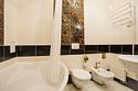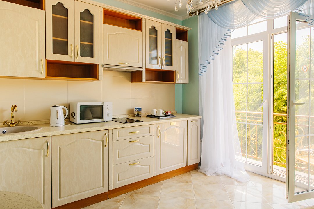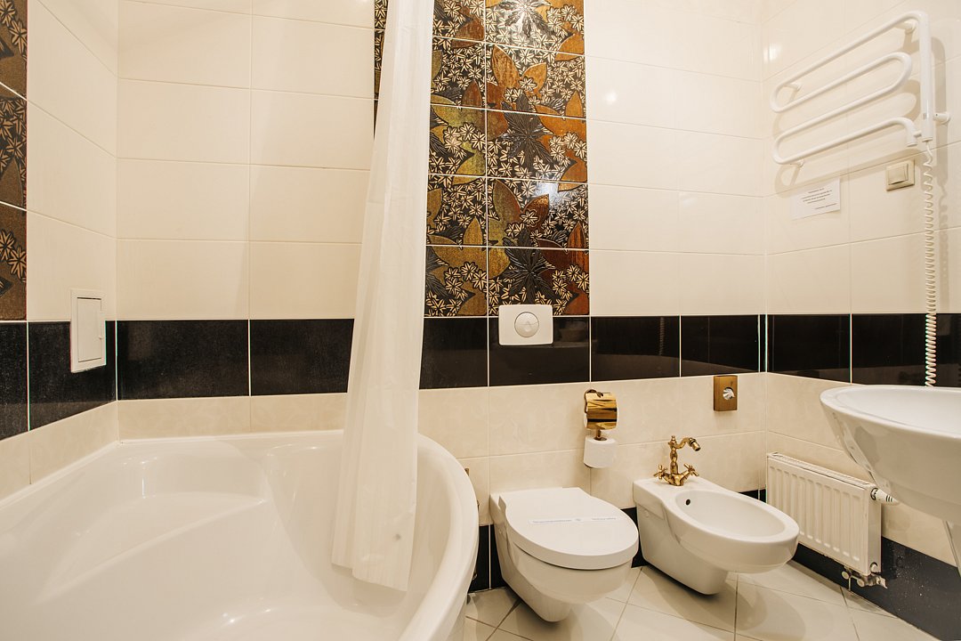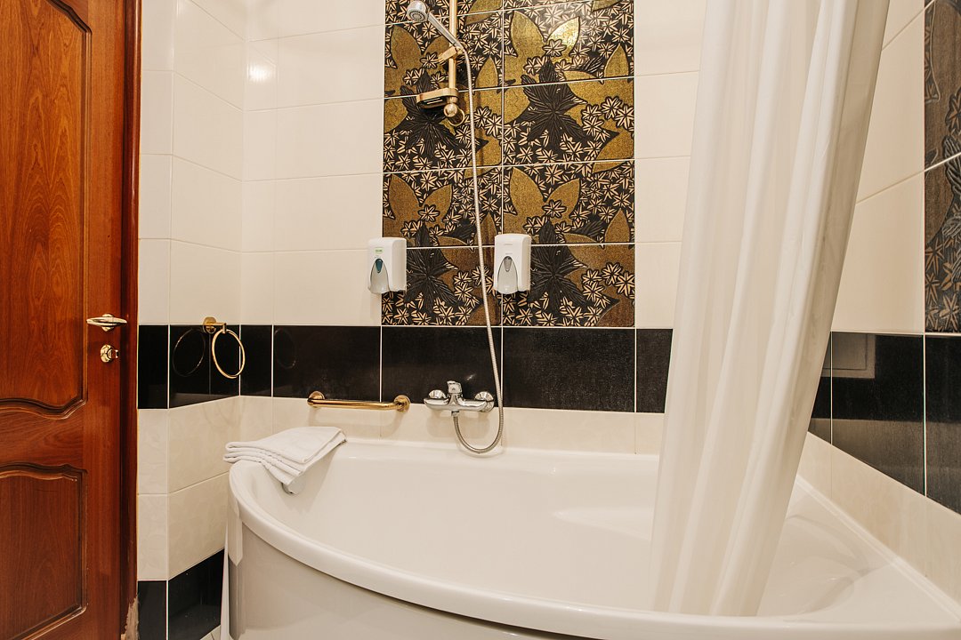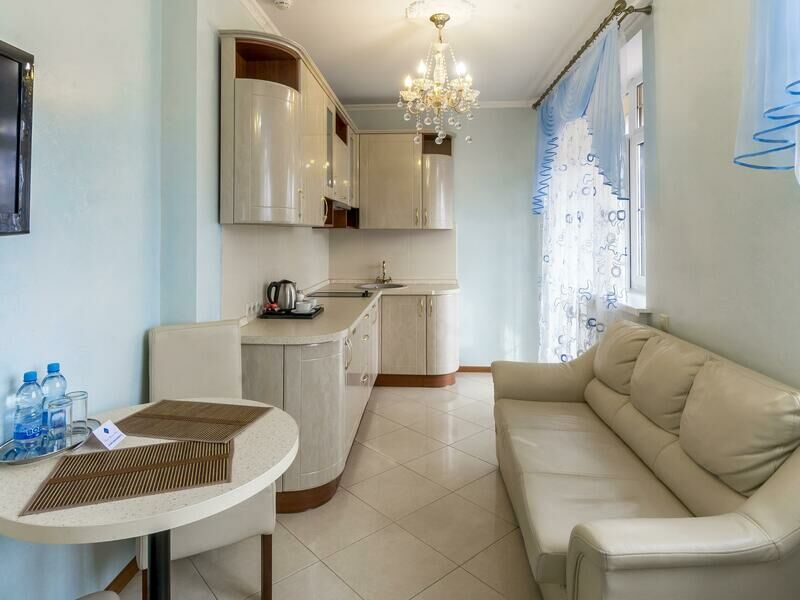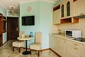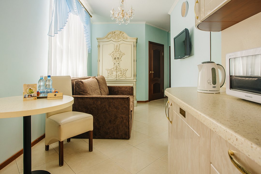 Апартаменты, площадь от 40 кв.м. с одной большой двуспальной кроватью. Удобства номера: Гостиная-столовая с кухней: холодильник, плита, стол, стулья, диван, телевизор, посуда, чайный набор. Балкон вид на город. Спальная комната: большая двуспальная кровать, комод/зеркало, шкаф, телевизор, кондиционер, отопление, телефон, сейф, гладильные принадлежности Ванная комната: ванная, туалет, биде, раковина, фен, бесплатные туалетно-косметические принадлежности, халат, тапочки. В номере возможно размещение дополнительных мест для взрослых и детей.